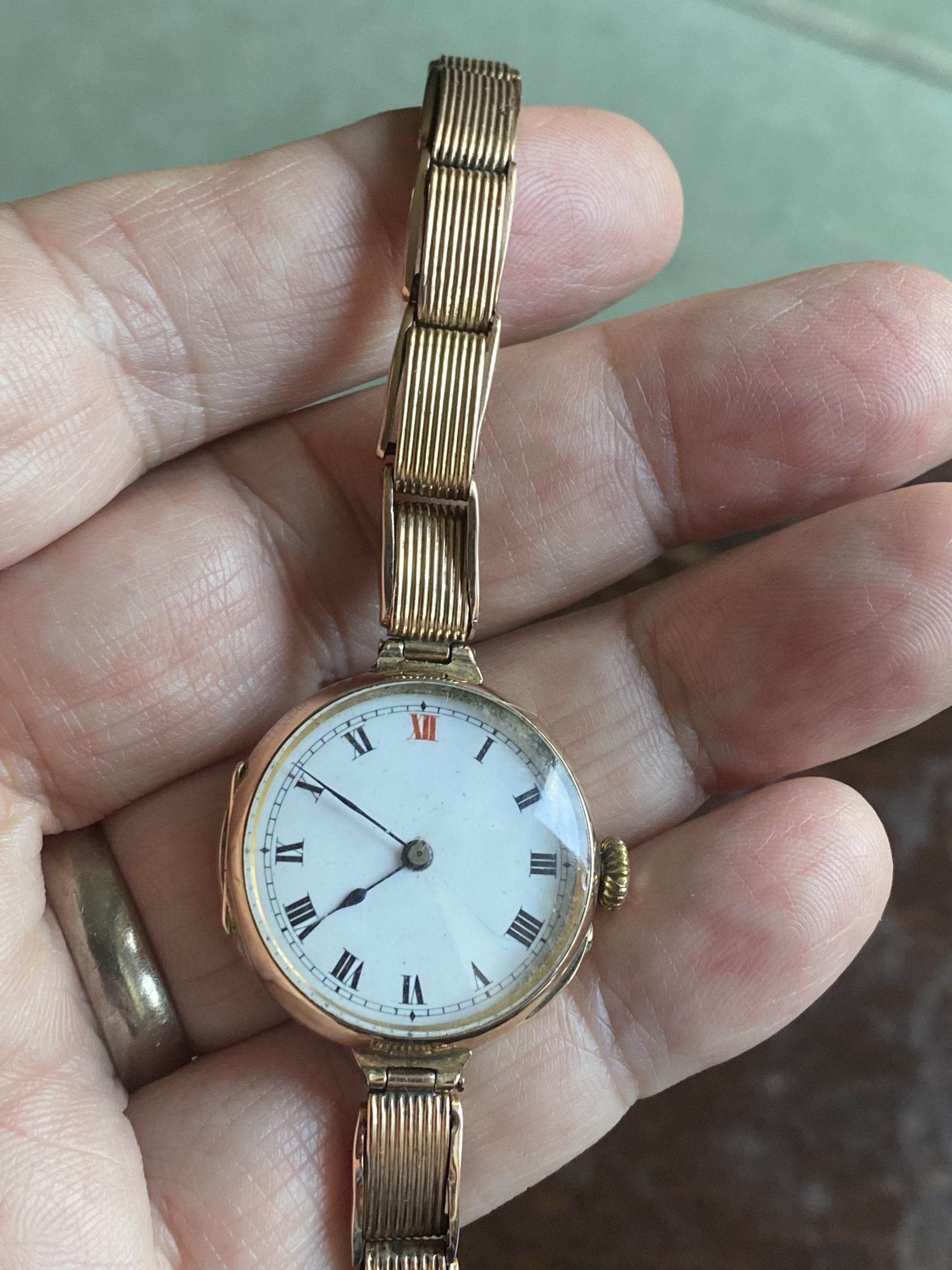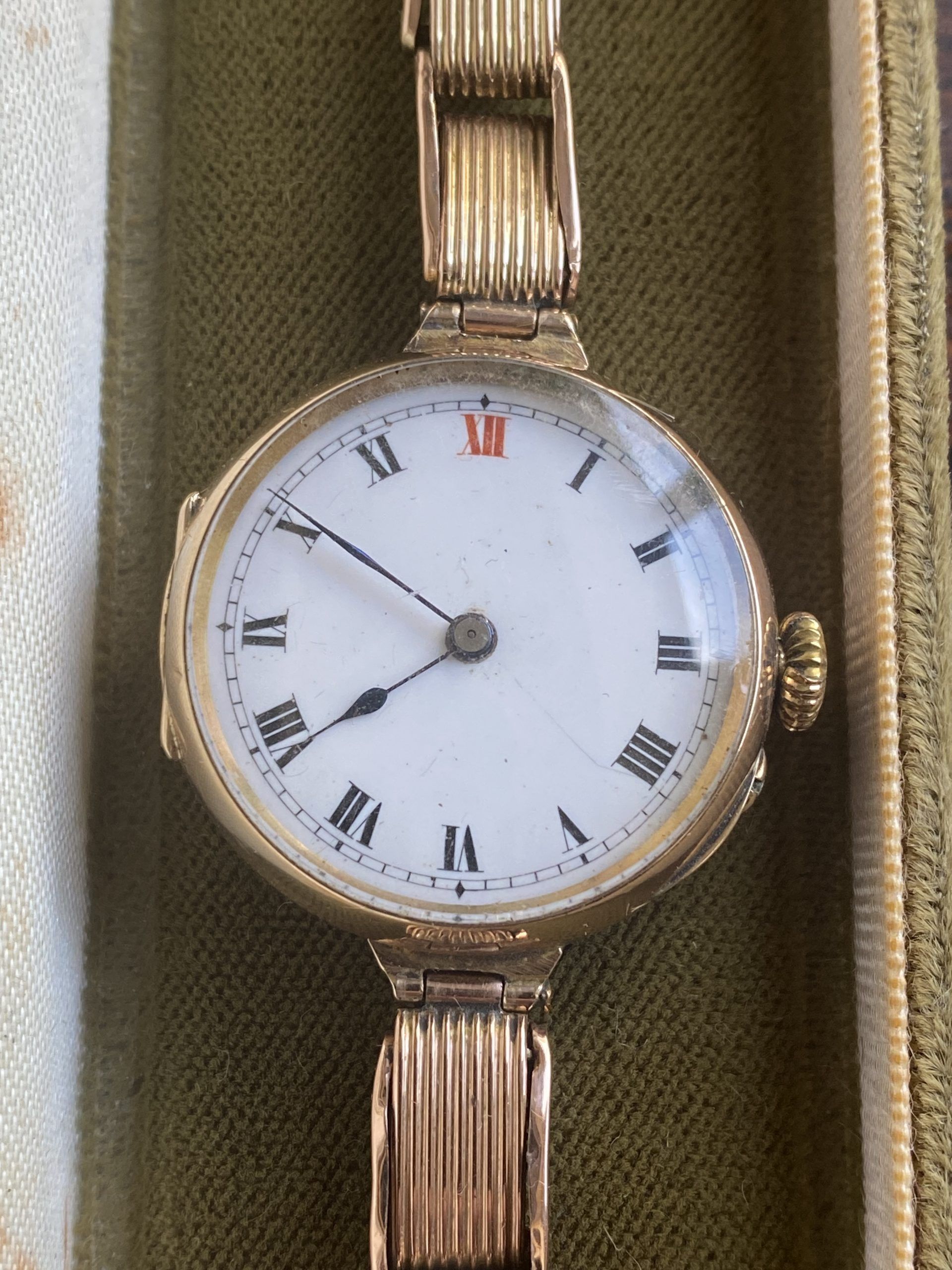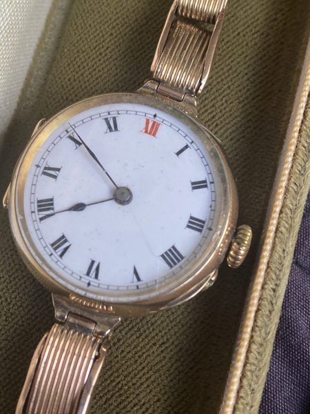 A superb quality WW1 era antique solid 9ct rose gold wristwatch with its original very rare solid rose gold expandable bracelet, in outstanding condition.