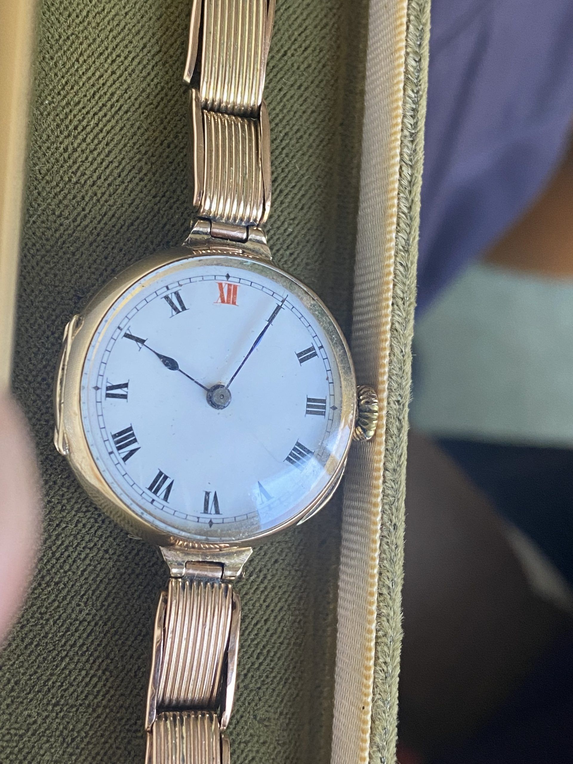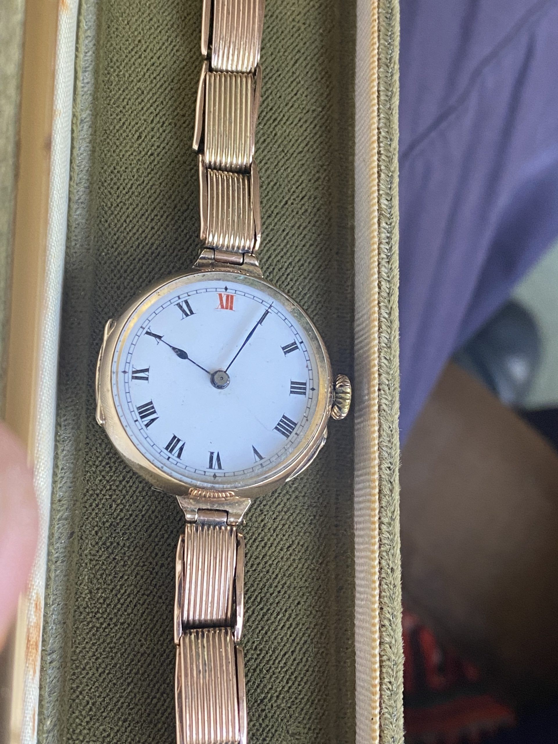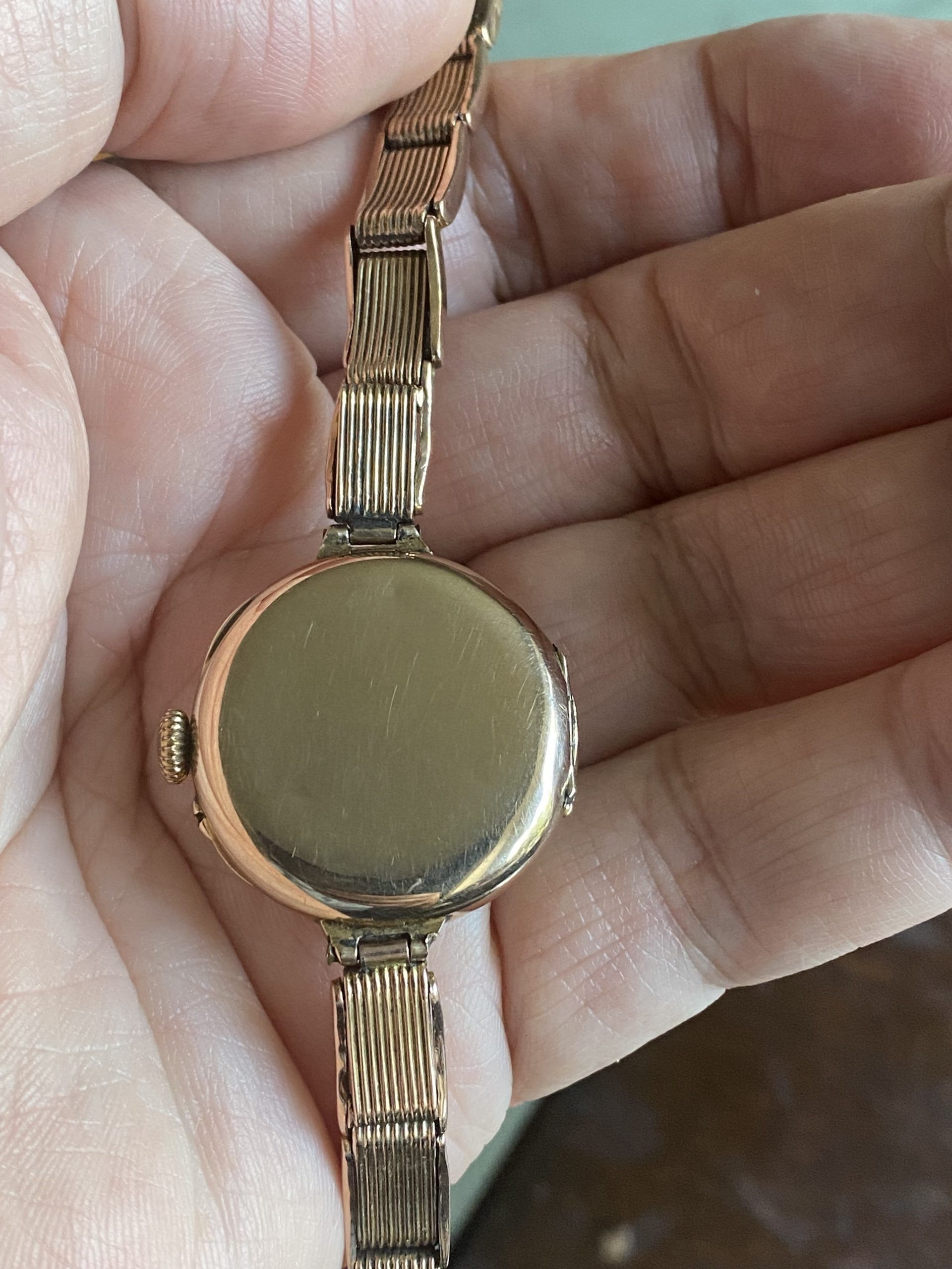 A superb quality WW1 era antique solid 9ct rose gold wristwatch with its original very rare solid rose gold expandable bracelet, in outstanding condition.