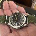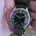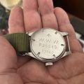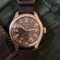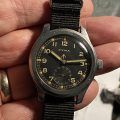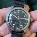 This is the largest of all twelve of the Dirty Dozen WW2 issued watches at 38mm case diameter. It has spade-loads if wrist presence.