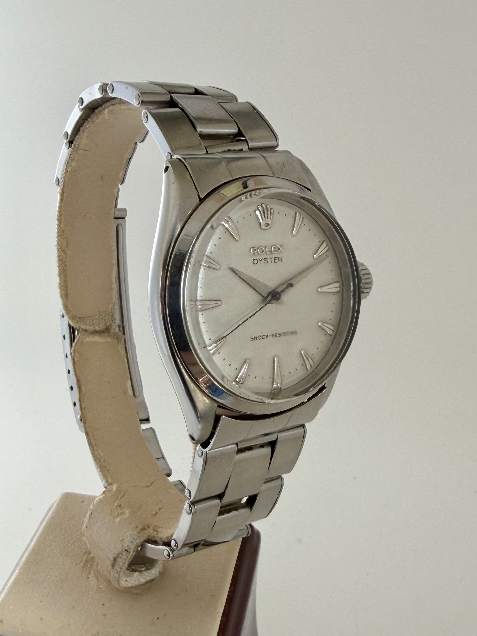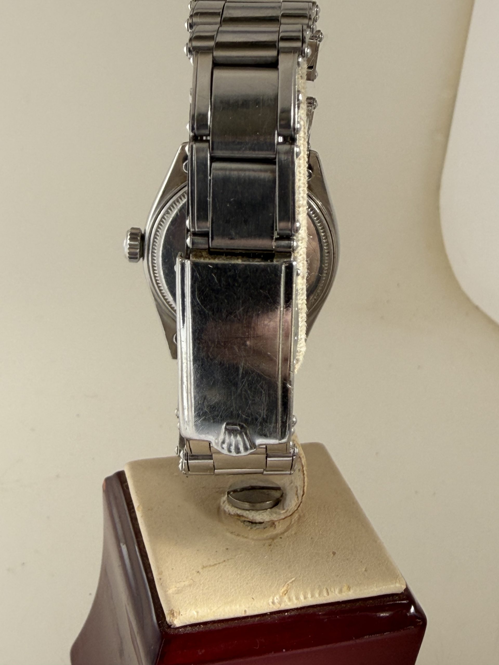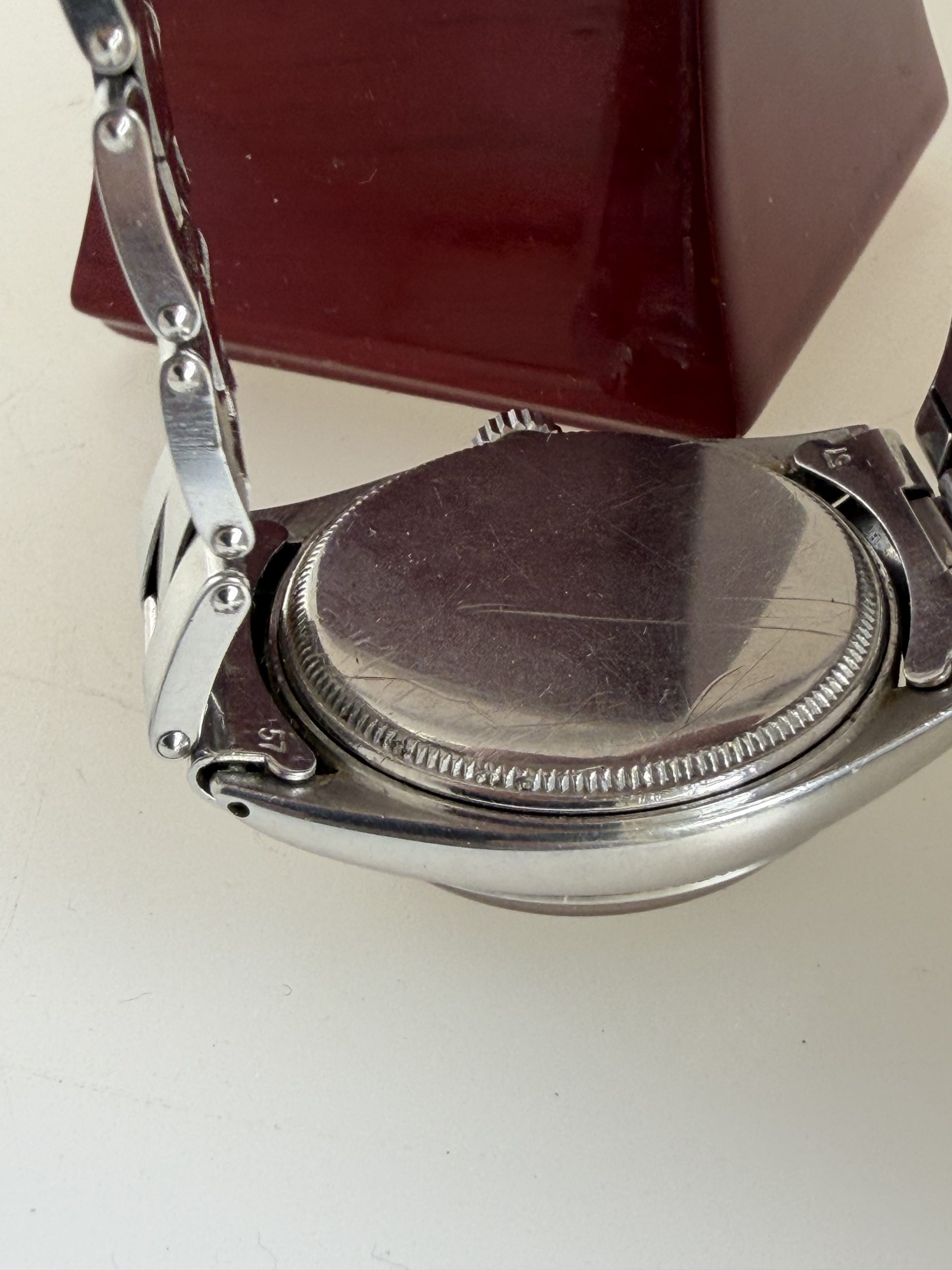 The inner caseback is stamped “Montres Roles SA Geneva Switzerland Patented Stainless Steel 6480” and also “III.55” for the Third Quarter of 1955.