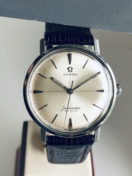 From 1964 comes this what looks like an unused Seamaster De Ville in near New Old Stock Condition. An Omega Seamaster De Ville with truly outstanding Lovely Dial with rare “doorstep” hour markers and Superb cross-hairs dial in mint original factory finish condition with not a mark on it.