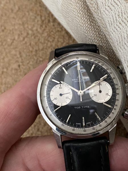 | Model: | Vintage c1965 Top Time Geneve Ref. 2002 in Steel with Perfect Original “James Bond” Black Dial with Two Silver Sub-Dials and Original Signed Crown Breitling on Breitling Strap and Buckle. Breitling Box included. |