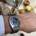 A domed crystal sits above a matte black dial. The wide minute track has pips that are coated in Tritium and large, Arabic numerals mark the hours. The hour and minute, sword-shaped hands are also coated in Tritium. The text is printed precisely with the T in a circle signifying Tritium. At 6 o’clock the Broad Arrow indicated British Government property. We’ve paired the watch on a NATO strap in keep with how it was worn during action.