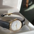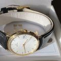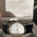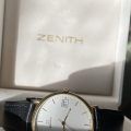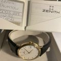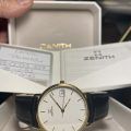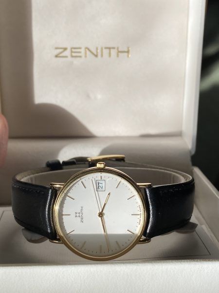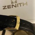 Gents (but would also suit a woman) Solid 9ct Gold Zenith with NoS black strap, Zenith gold buckle and its original white box and original Papers.