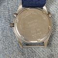 It has a quartz chronograph movement and a sand-blasted all stainless steel case with fixed military bars for operational reasons. The dial is mat black with subsidiary seconds at the 6 position, and the thirty minute elapsed timer at 12. there is a twenty four hour time representation at the 9 position, which is for pilots to calculate flight plans across different time zones. The inner bezel has sixty second markings and the chronograph sixty second recorder is the sweep hand. Some light marks to the case as to be expected in an ex-military watch but is otherwise in superb condition.