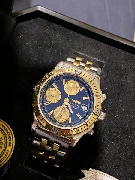 This particular also watch features a distinctive and rare original Breitling special order blue dial with gold-accented subdials and a matching gold bezel, contrasting with the stainless steel case and original solid gold and steel Breitling bracelet.
