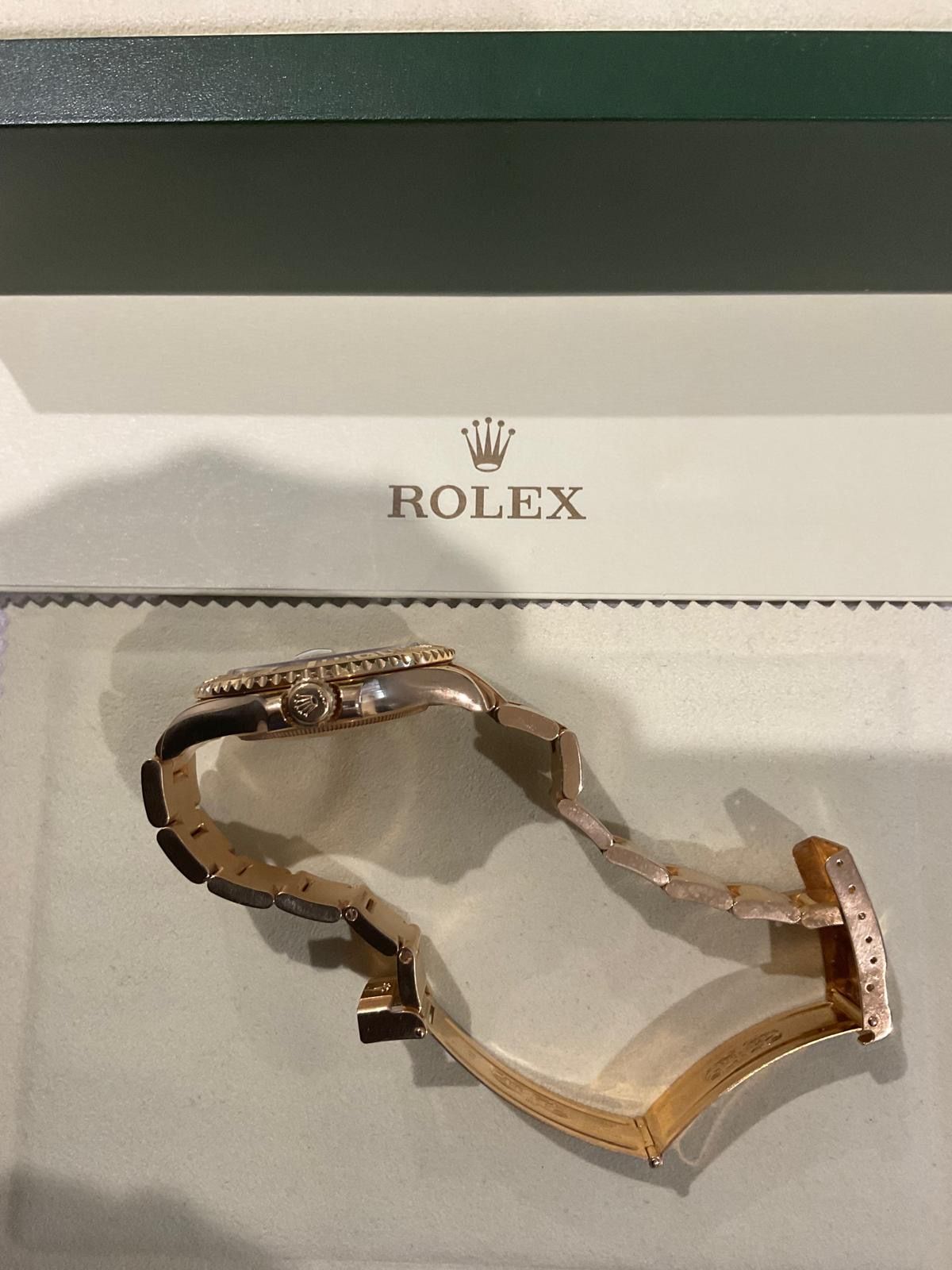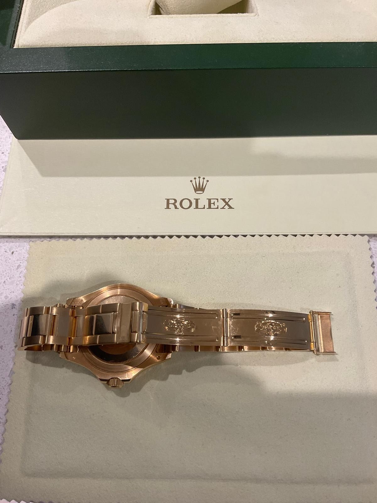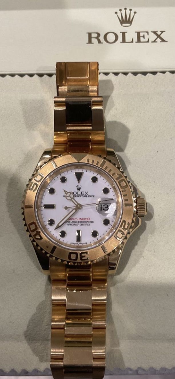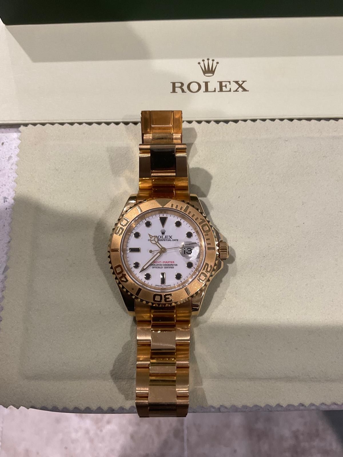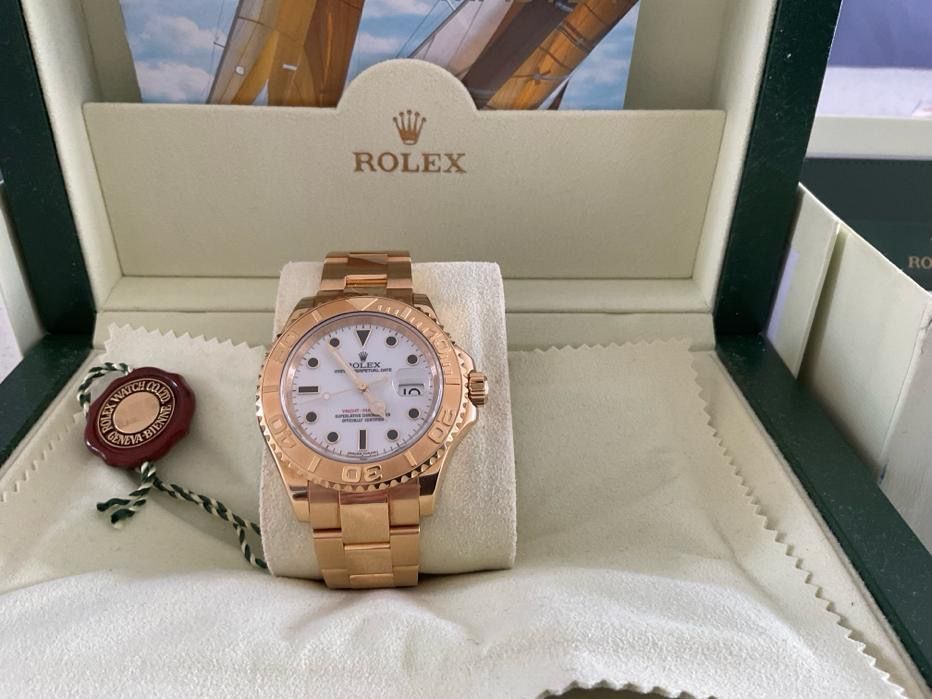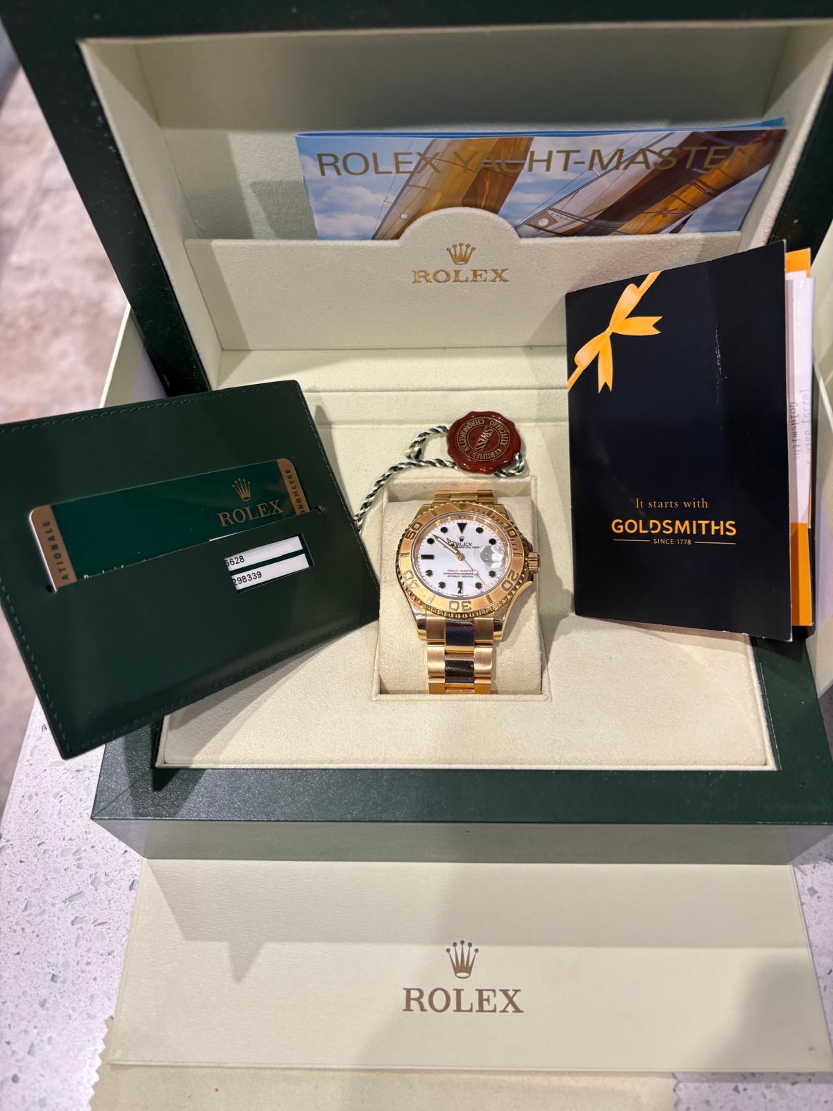 The watch comes with everything including: inner and outer Rolex boxes; solid gold bracelet; hang/tag; Warranty Card; Yachtmaster Booklet Rolex Wallets; Goldmiths Booklet.