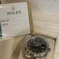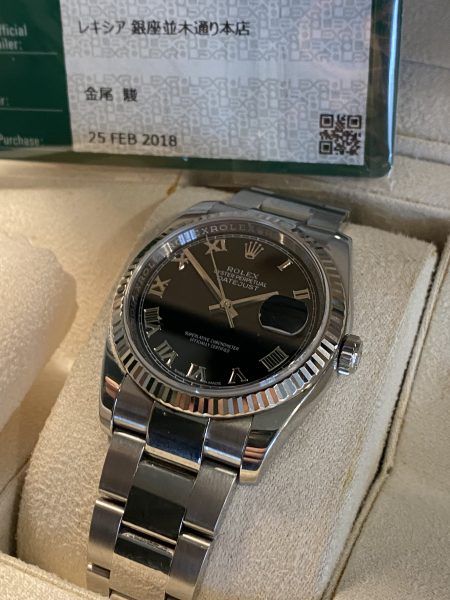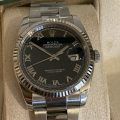 Lovely condition Rolex Datejust 36 with box and papers and desirable and harder to find Rolex factory black dial with white gold Roman Numerals.