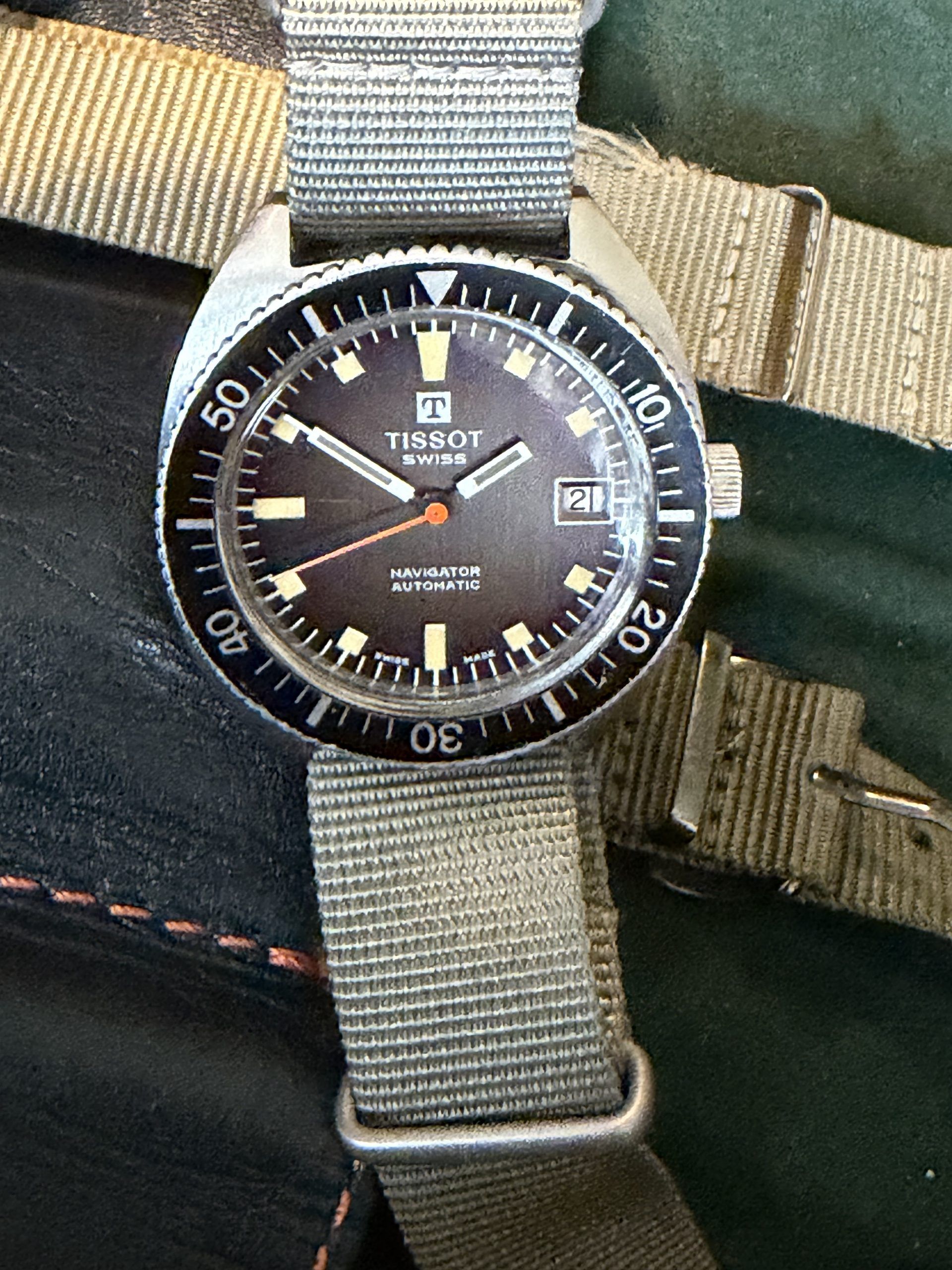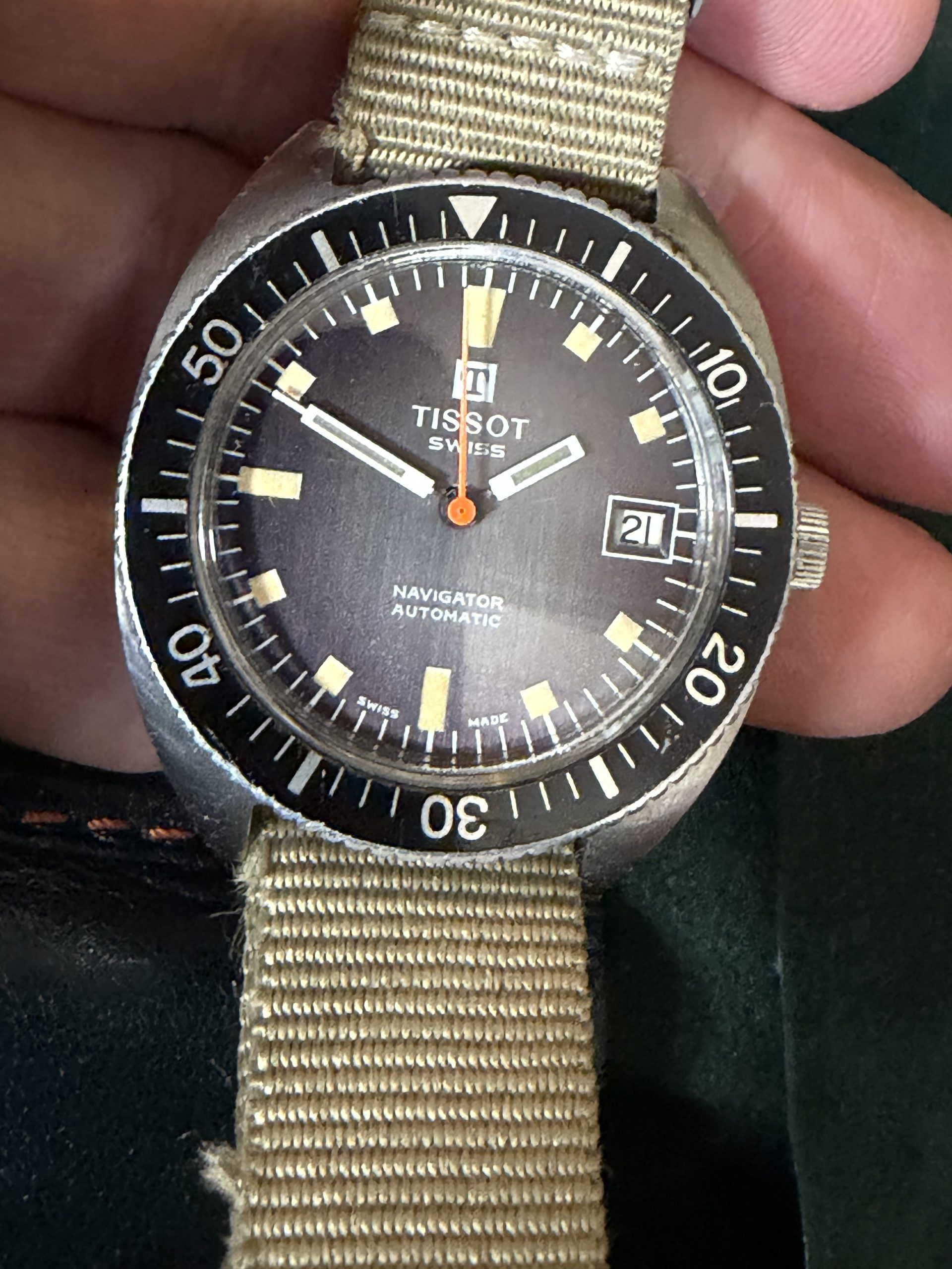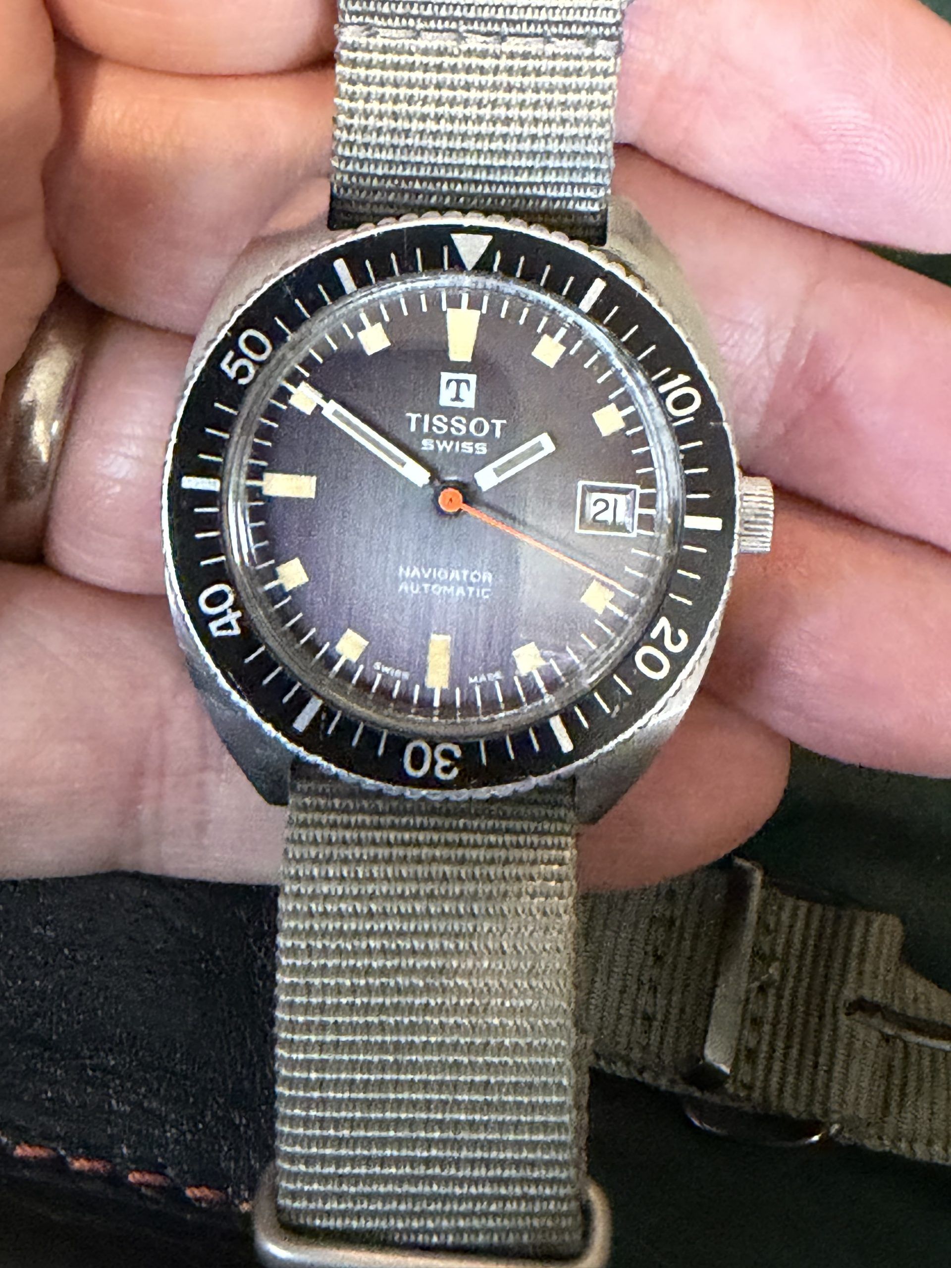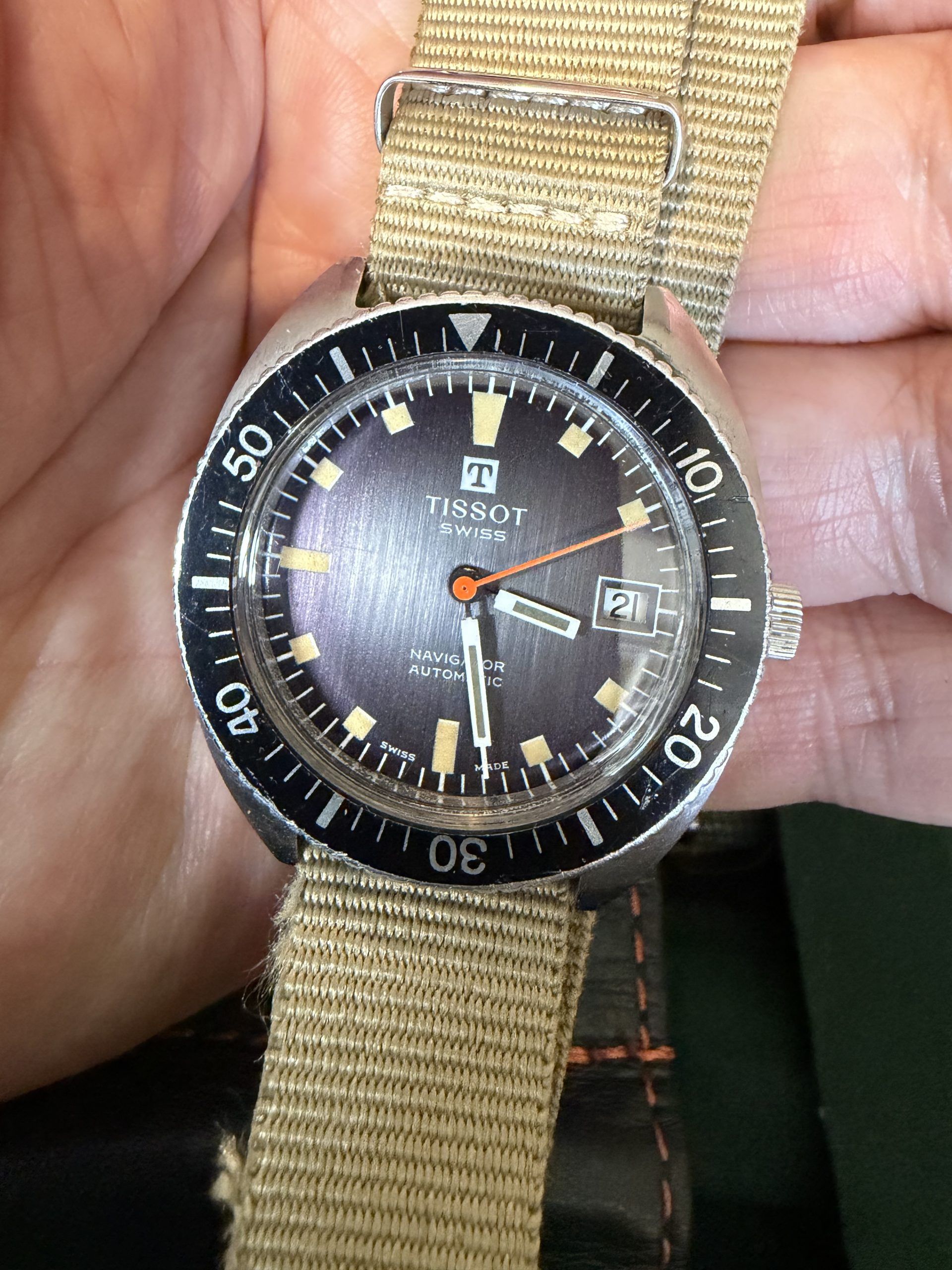 For sale is this recently fully serviced, grey sunburst dial, 1970’s diver’s style Tissot Navigator Automatic with date.