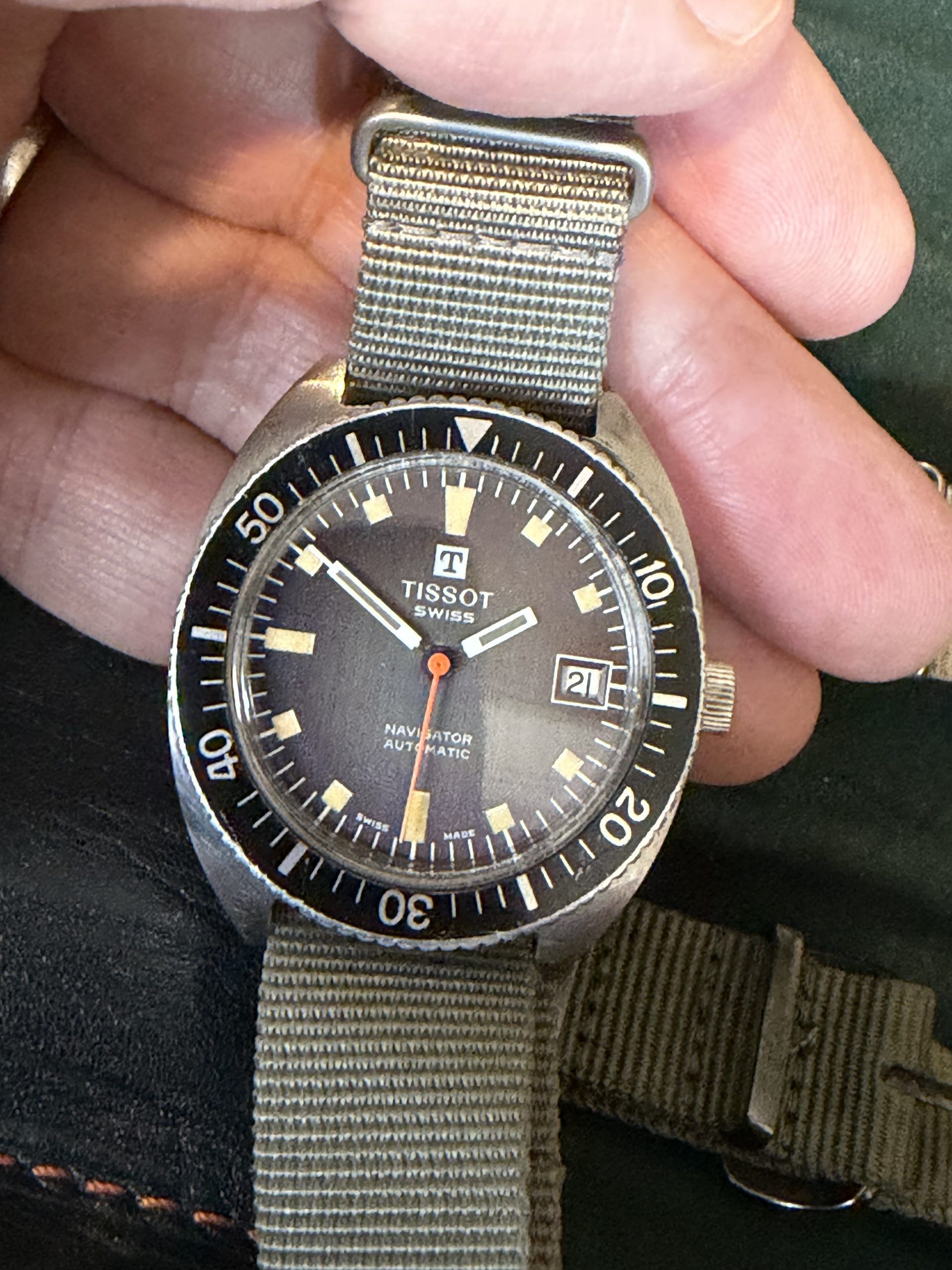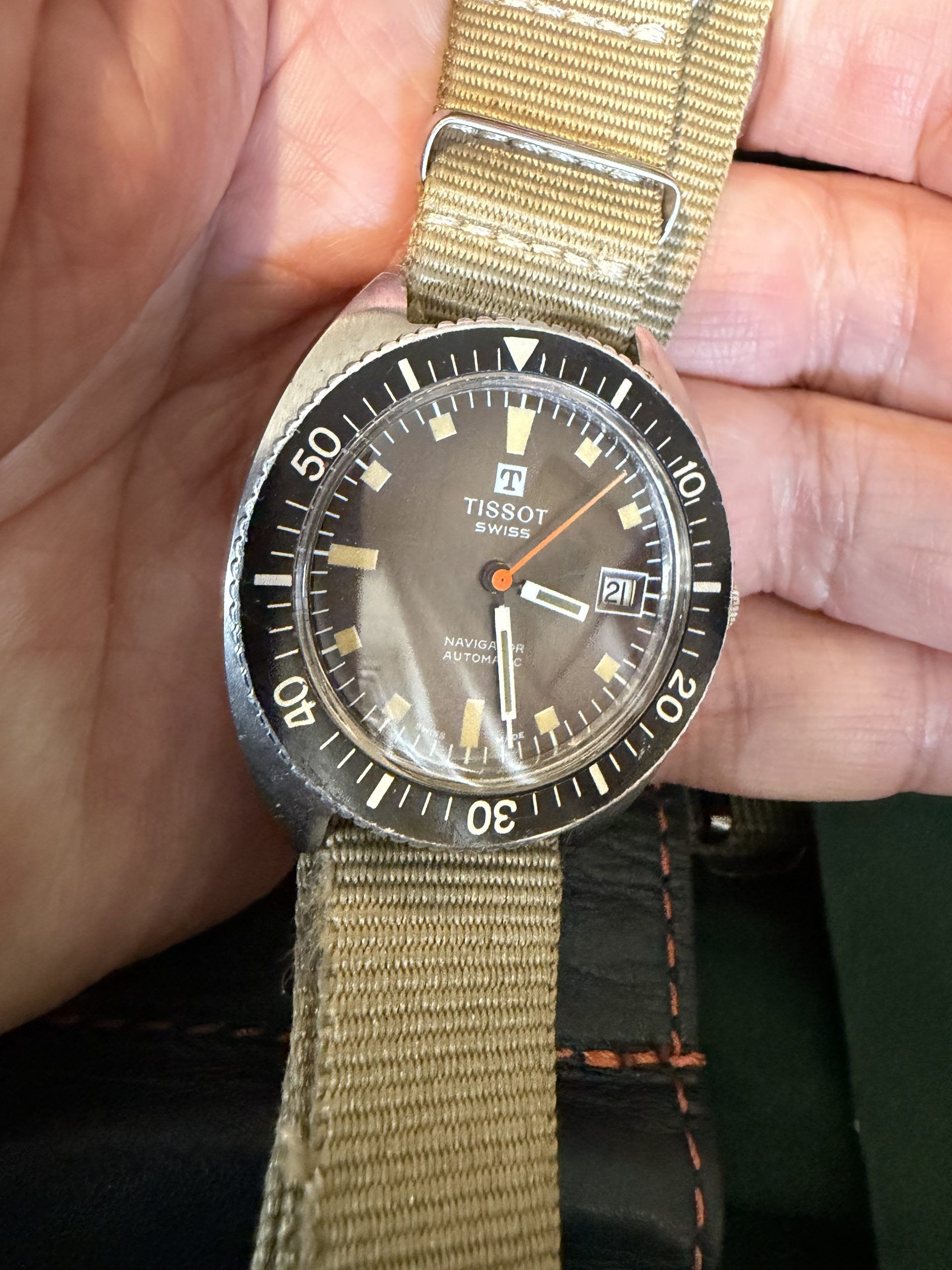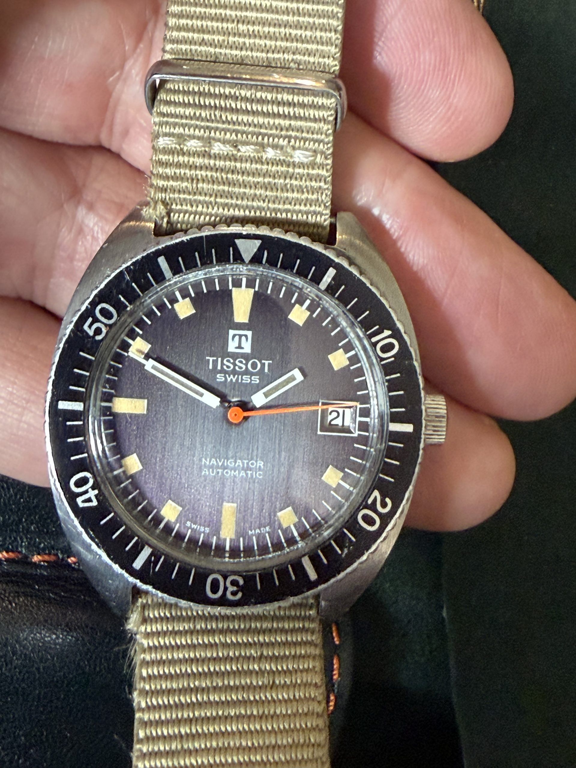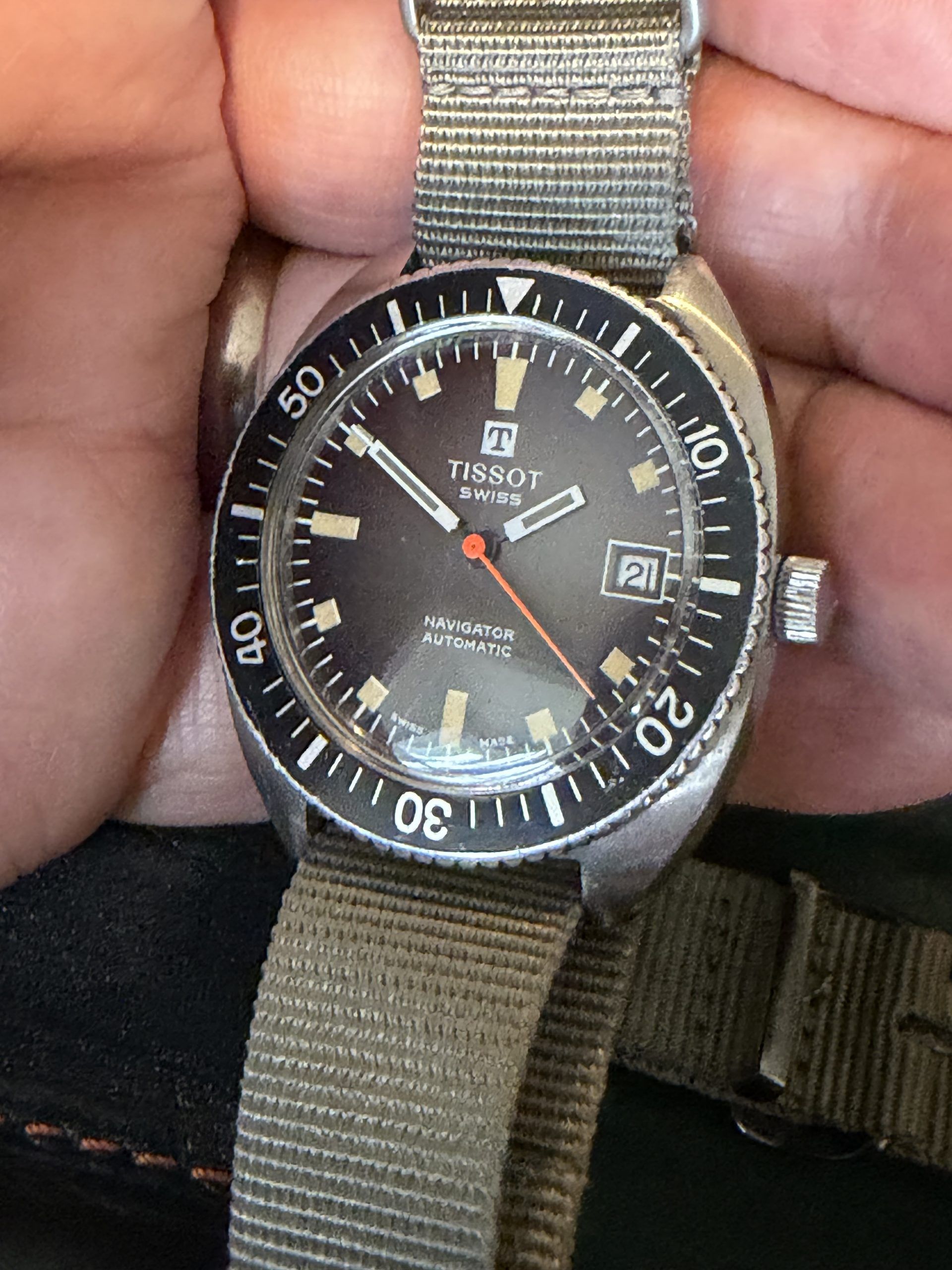 For sale is this recently fully serviced, grey sunburst dial, 1970’s diver’s style Tissot Navigator Automatic with date.