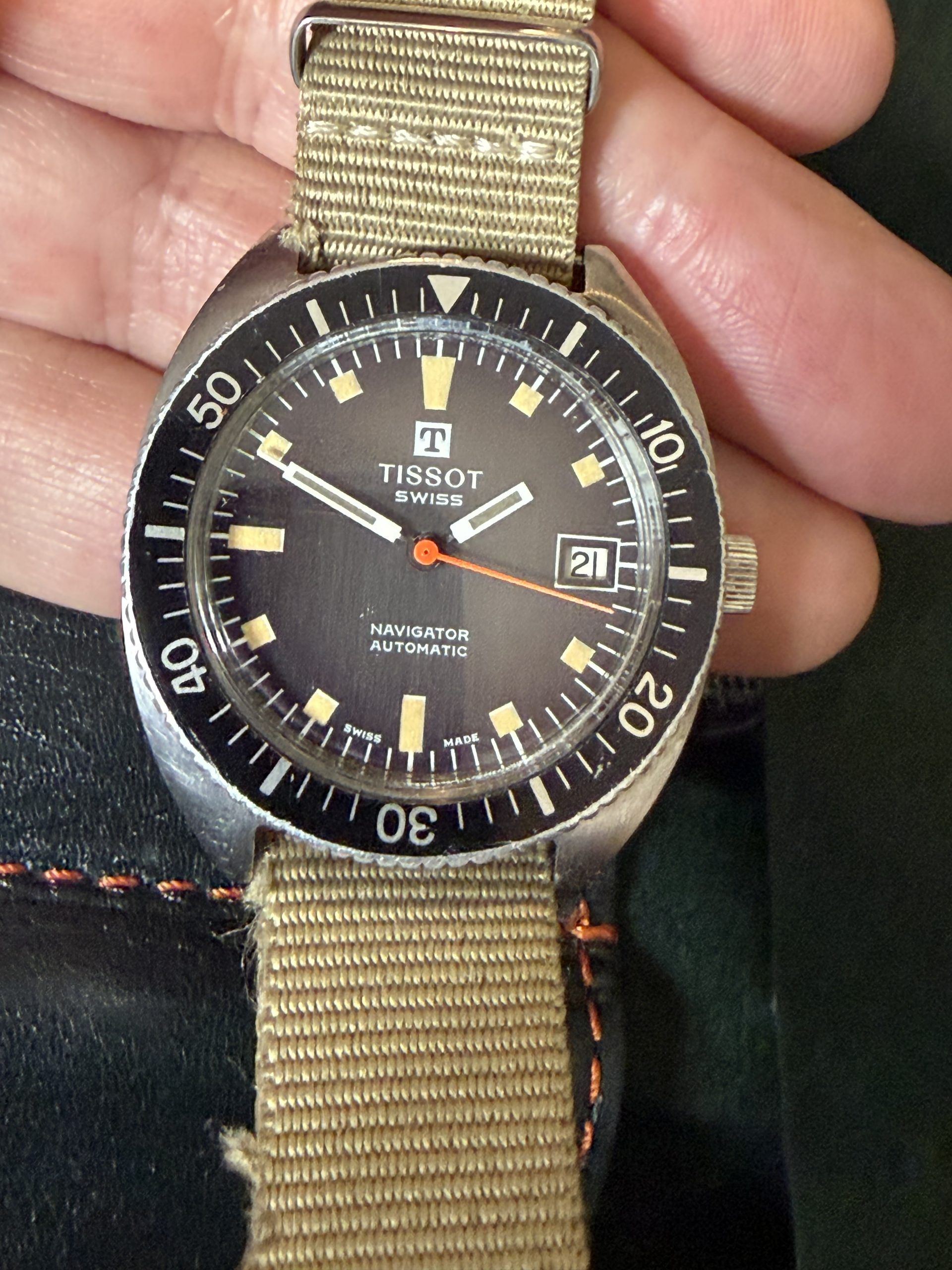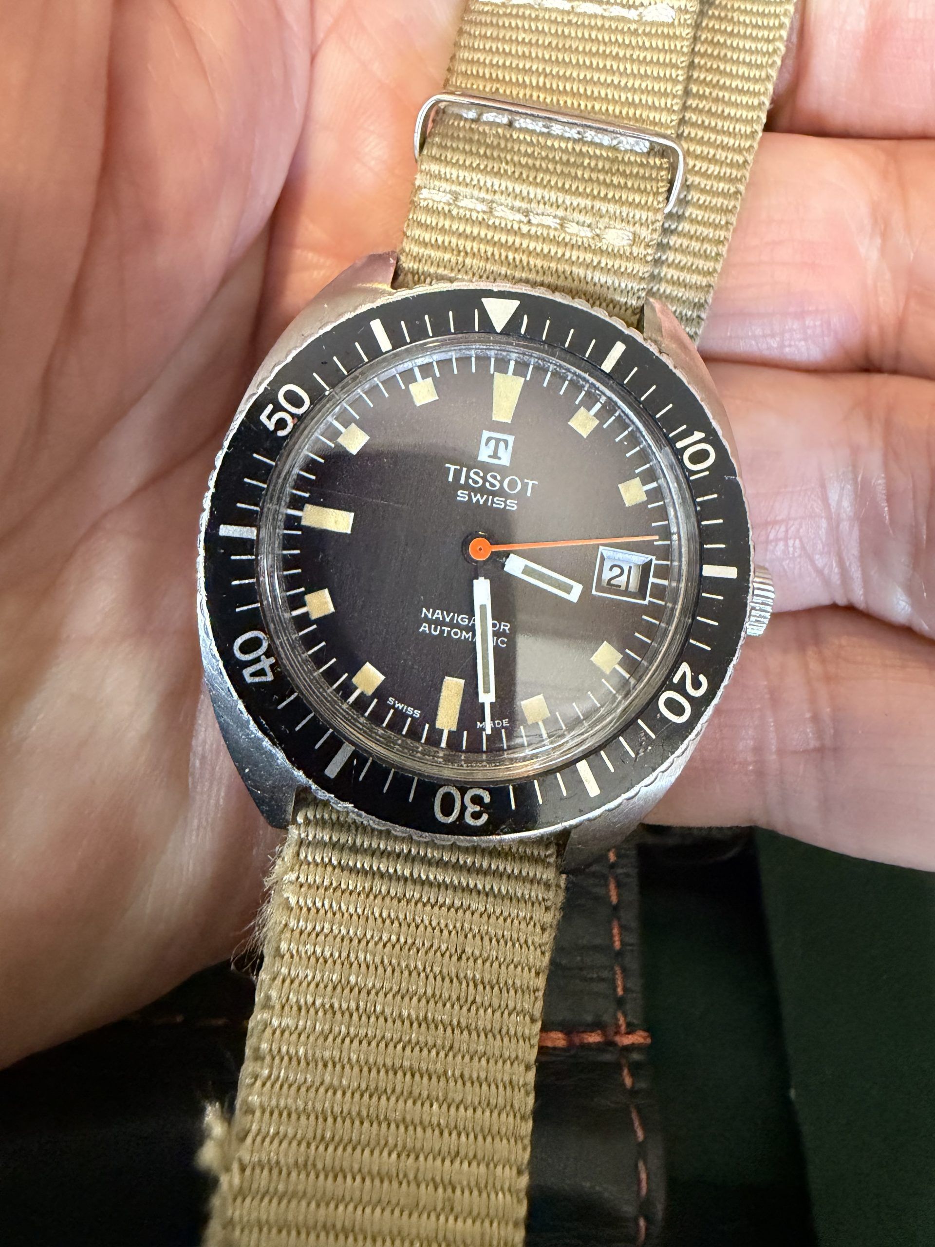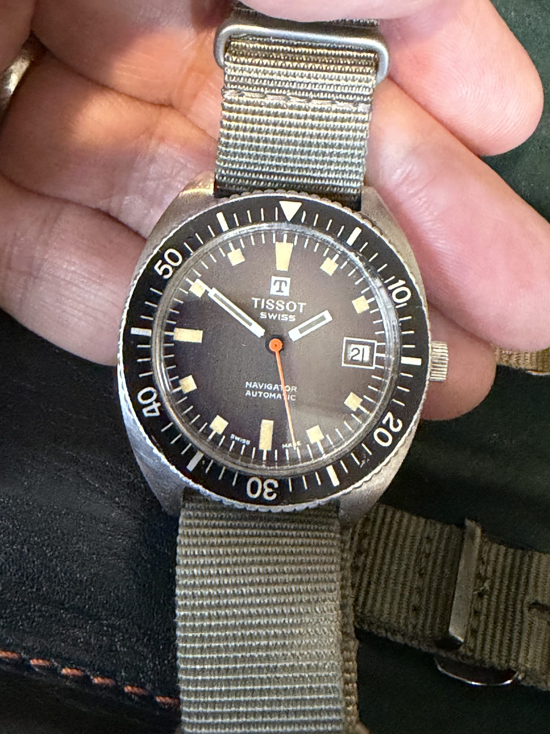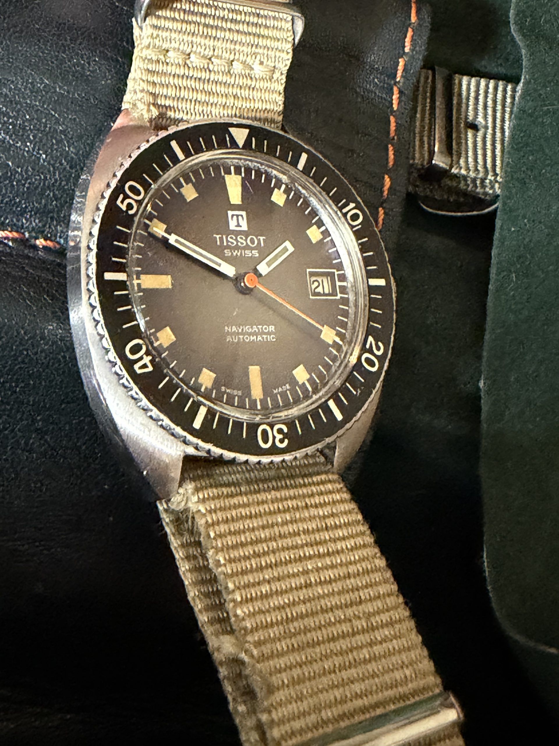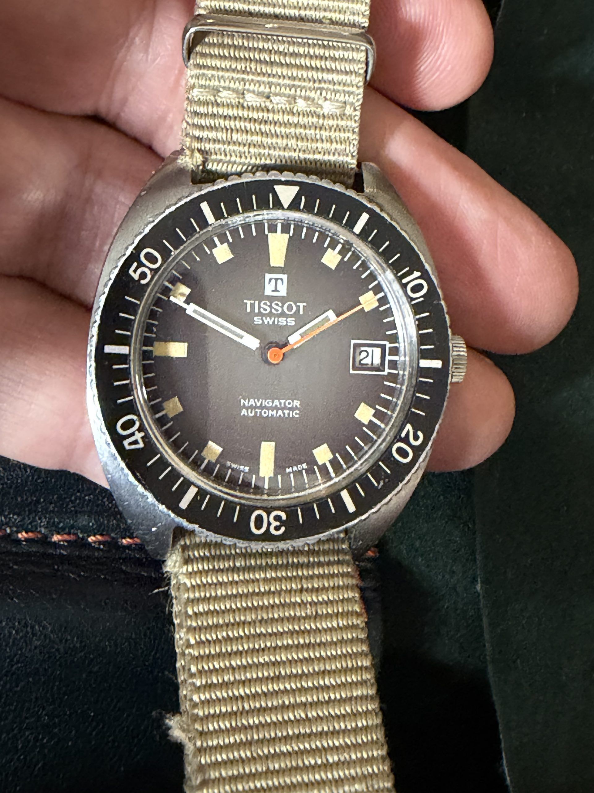 For sale is this recently fully serviced, grey sunburst dial, 1970’s diver’s style Tissot Navigator Automatic with date.