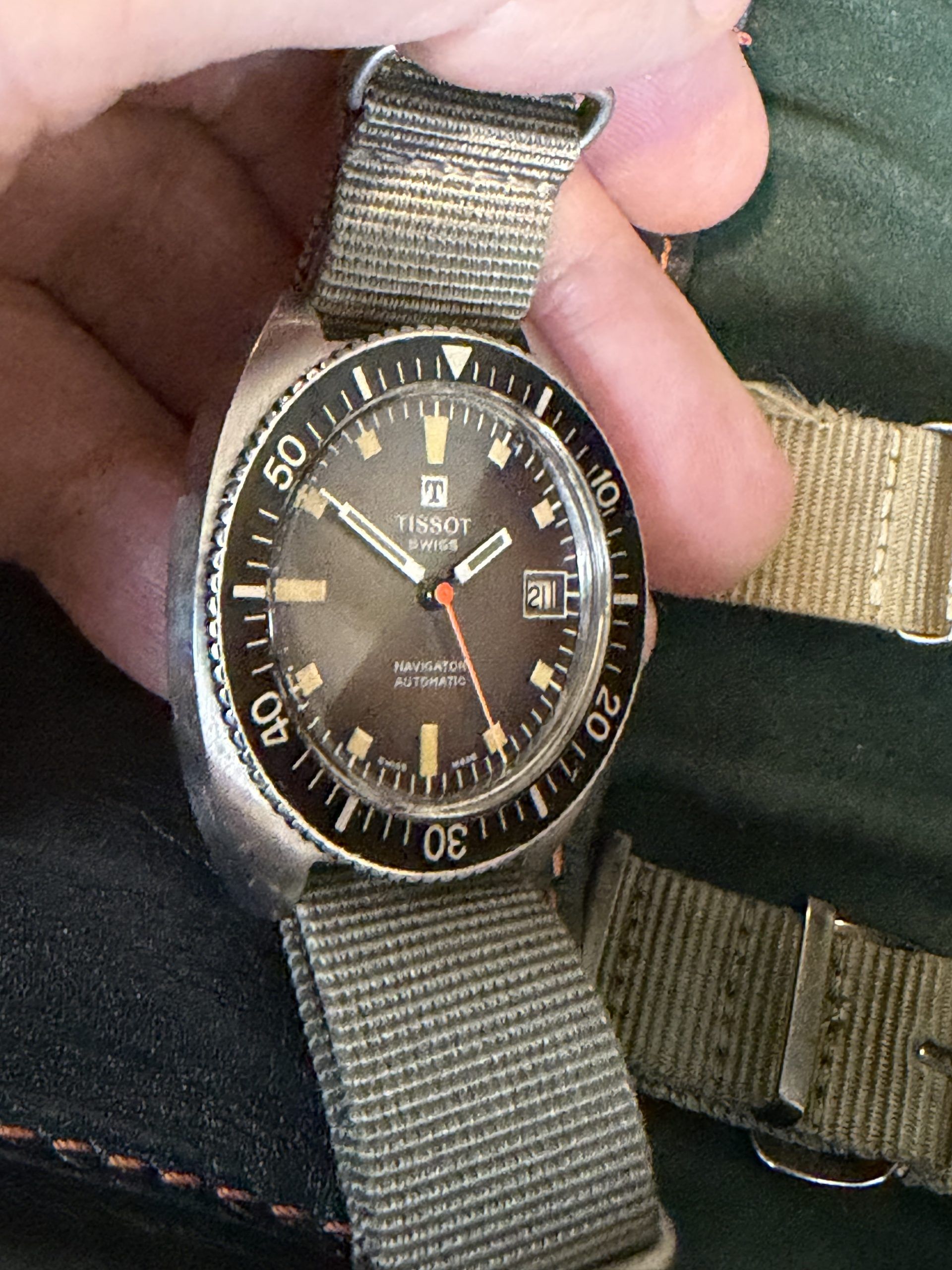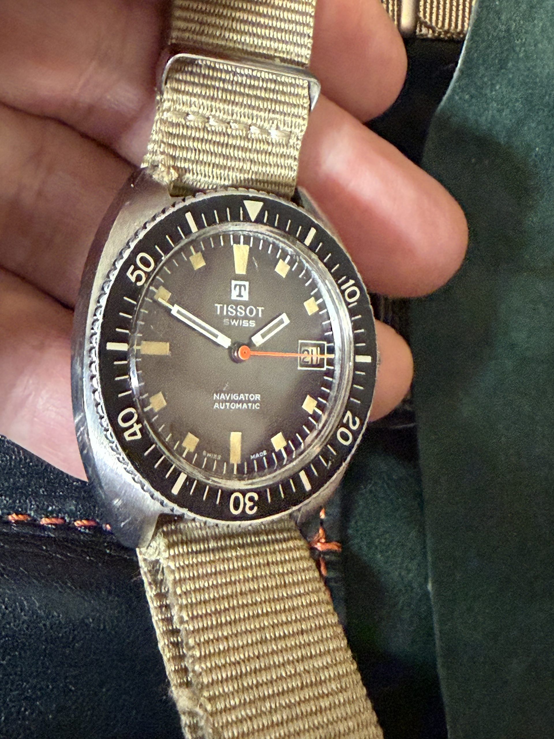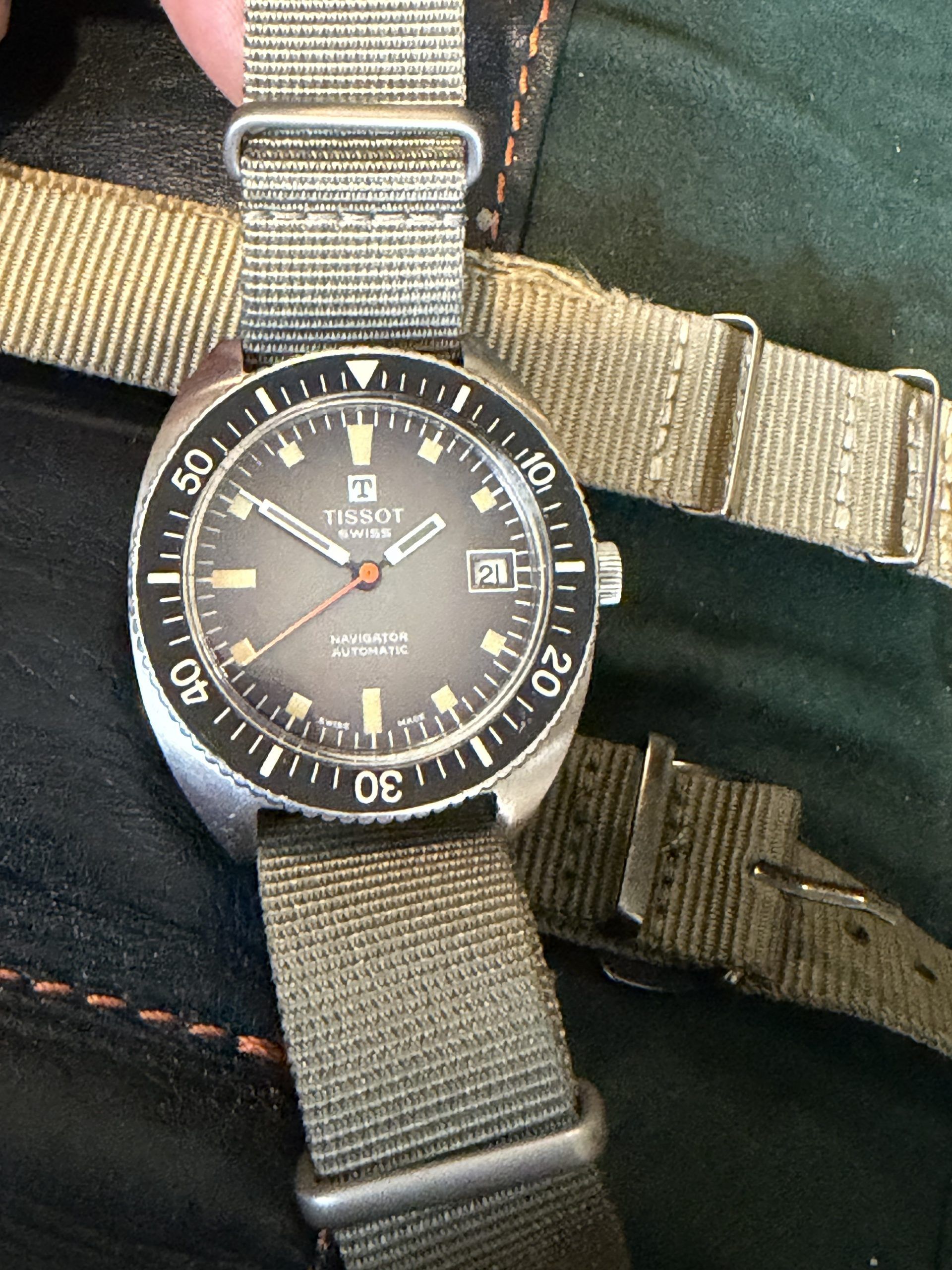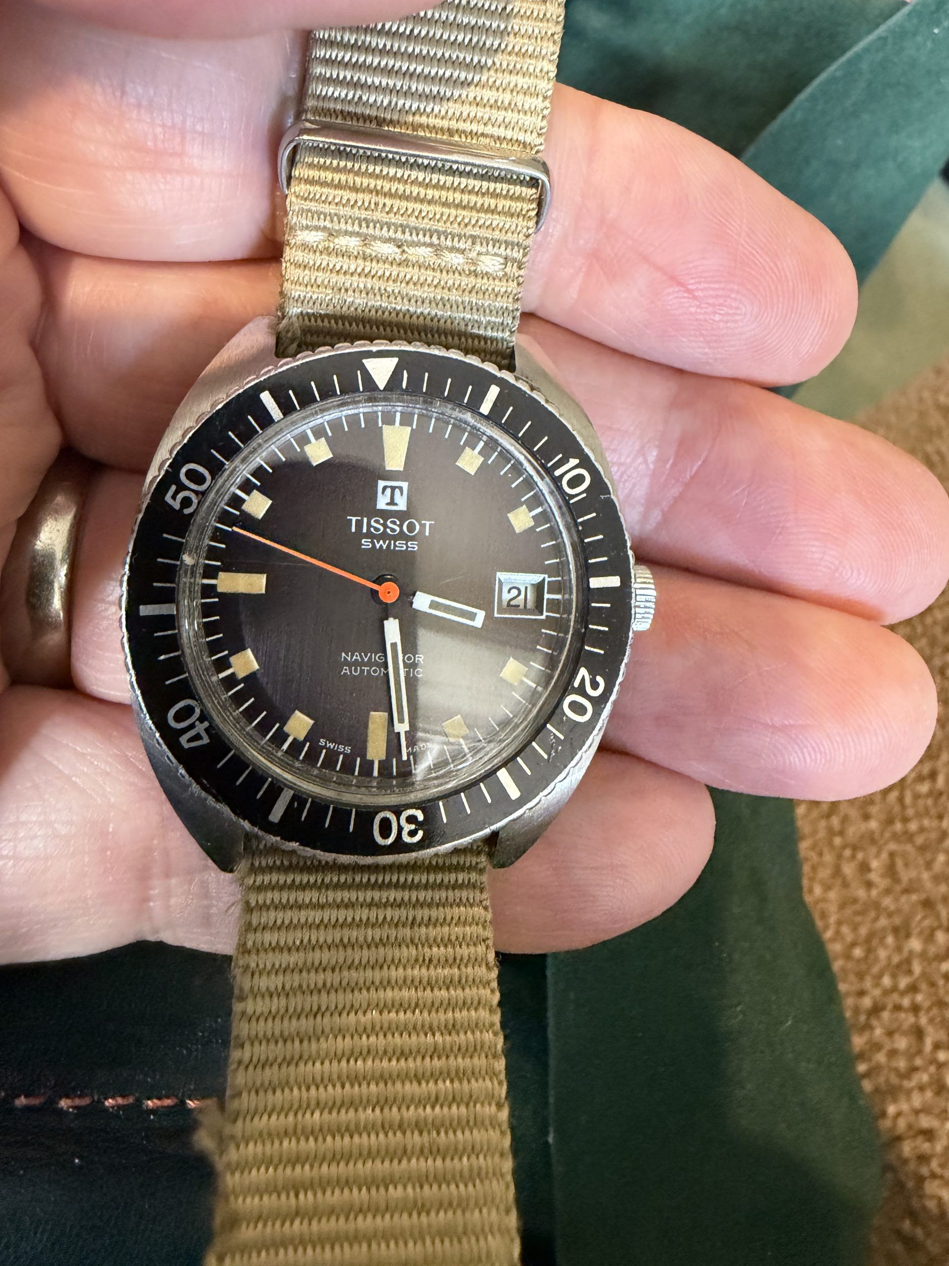 For sale is this recently fully serviced, grey sunburst dial, 1970’s diver’s style Tissot Navigator Automatic with date.