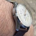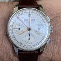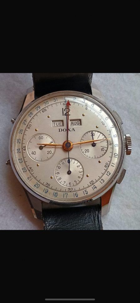 An amazing and rare find this unworn new stock Doxa triple date chronograph from 1948