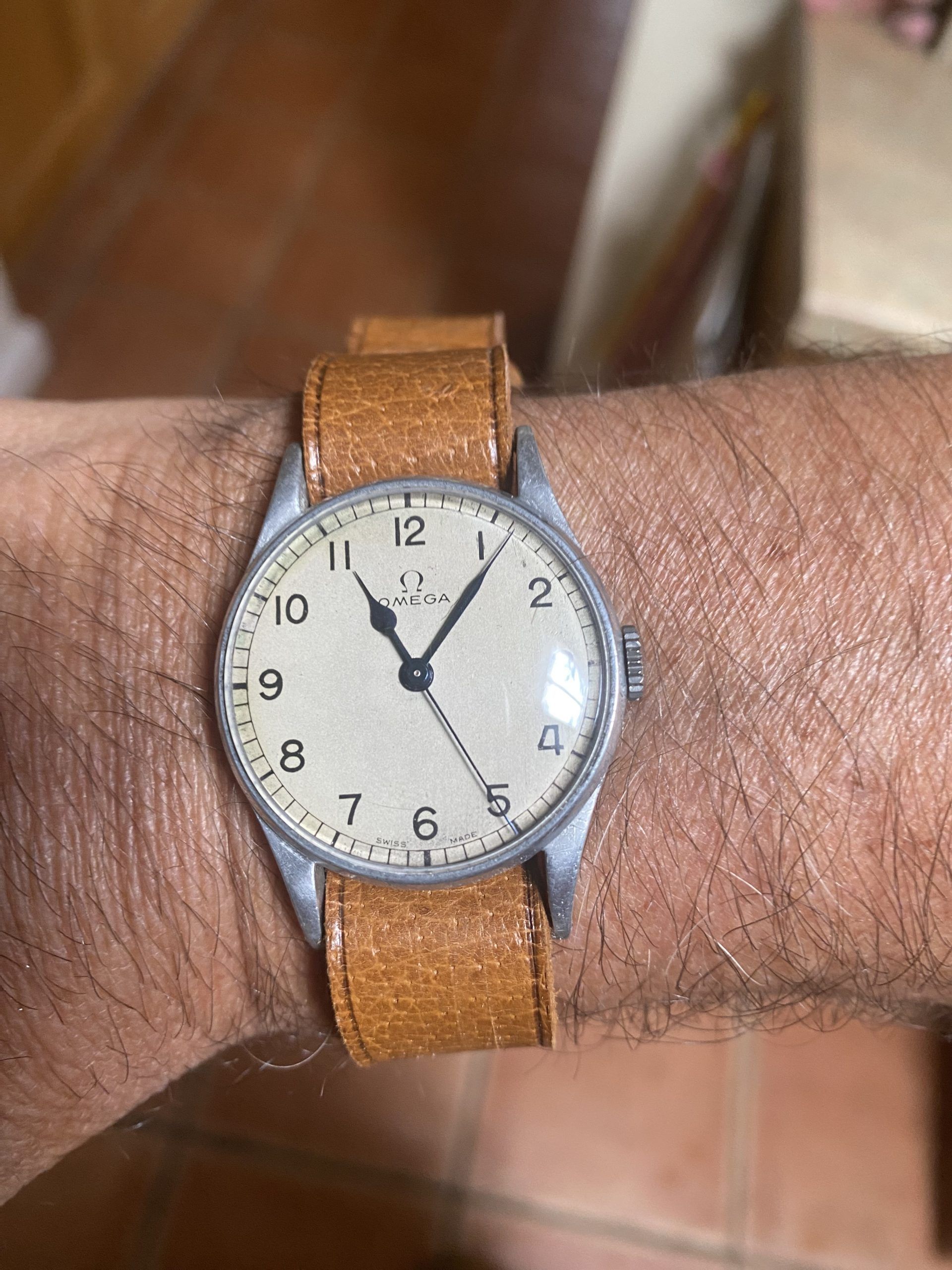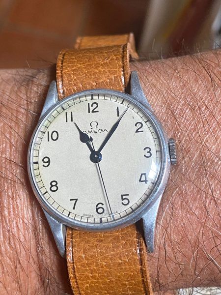 The watch has its original full length lugs Duralim alloy mid-case in superb condition with its original full length elegant lugs giving this watch its unique shape and curved fit to the wrist. Usually, these lugs have been shortened or re-drilled. Original stainless steel back with all the correct RAF issue markings on it. The date of manufacture of the watch in 1943 according to the Omega’s own records for the serial number on the movement. The movement is the legendary Omega 30T2 with centre seconds – one of the most robust and reliable workhorses Omega ever made and was capable of chronometer rated time keeping. This one has been fully serviced and is keeping time to within 5 seconds a day! Remarkable for a 80 year old watch. The dial is the original Omega with just the right patina. The blued steel hands are also original.
