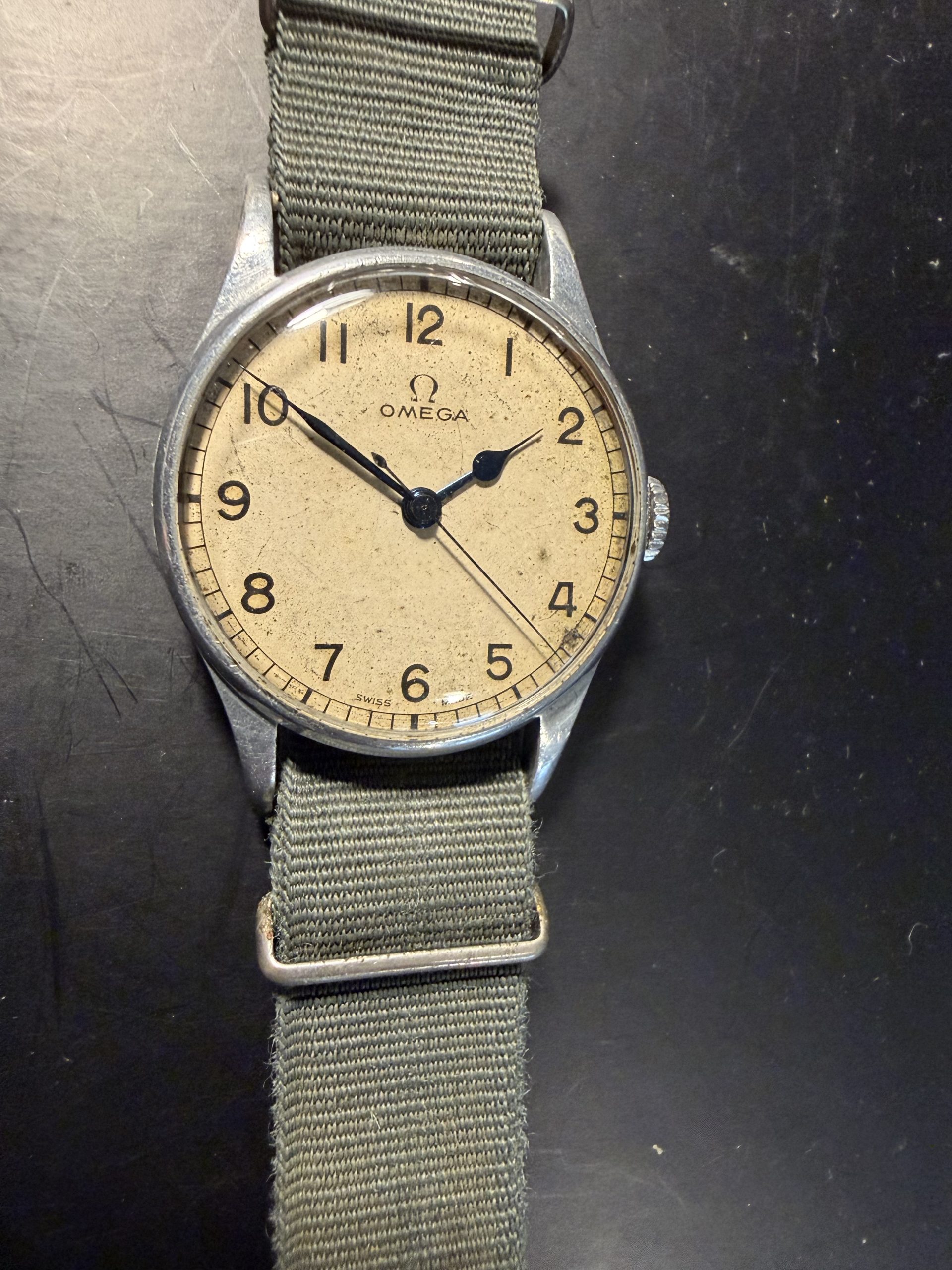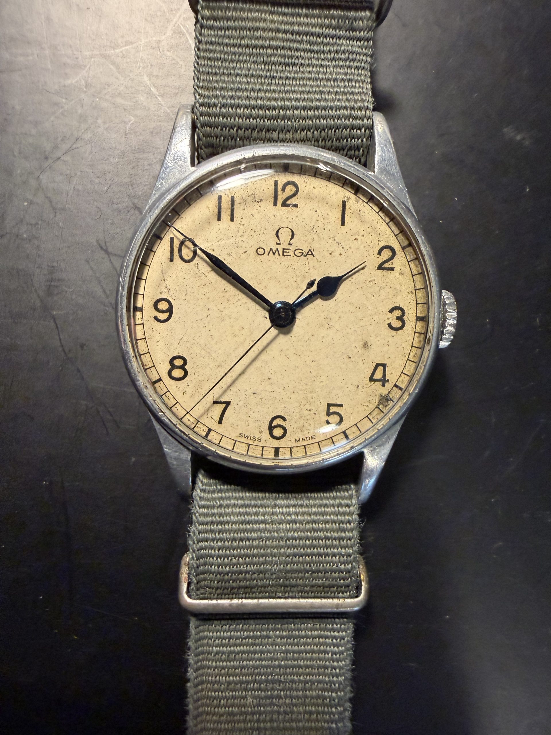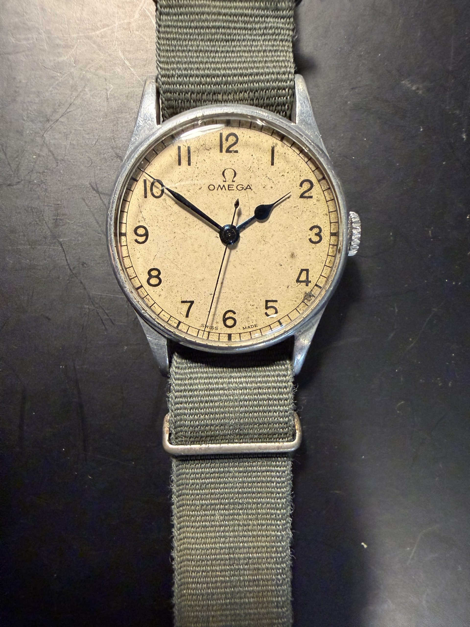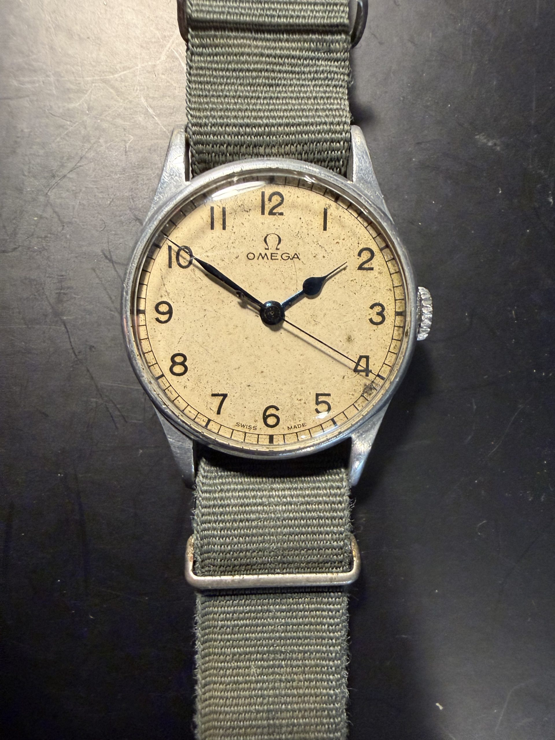 Lovely original military dial signed Omega Swiss Made with original blues-steel hands and correct unsigned winding crown.