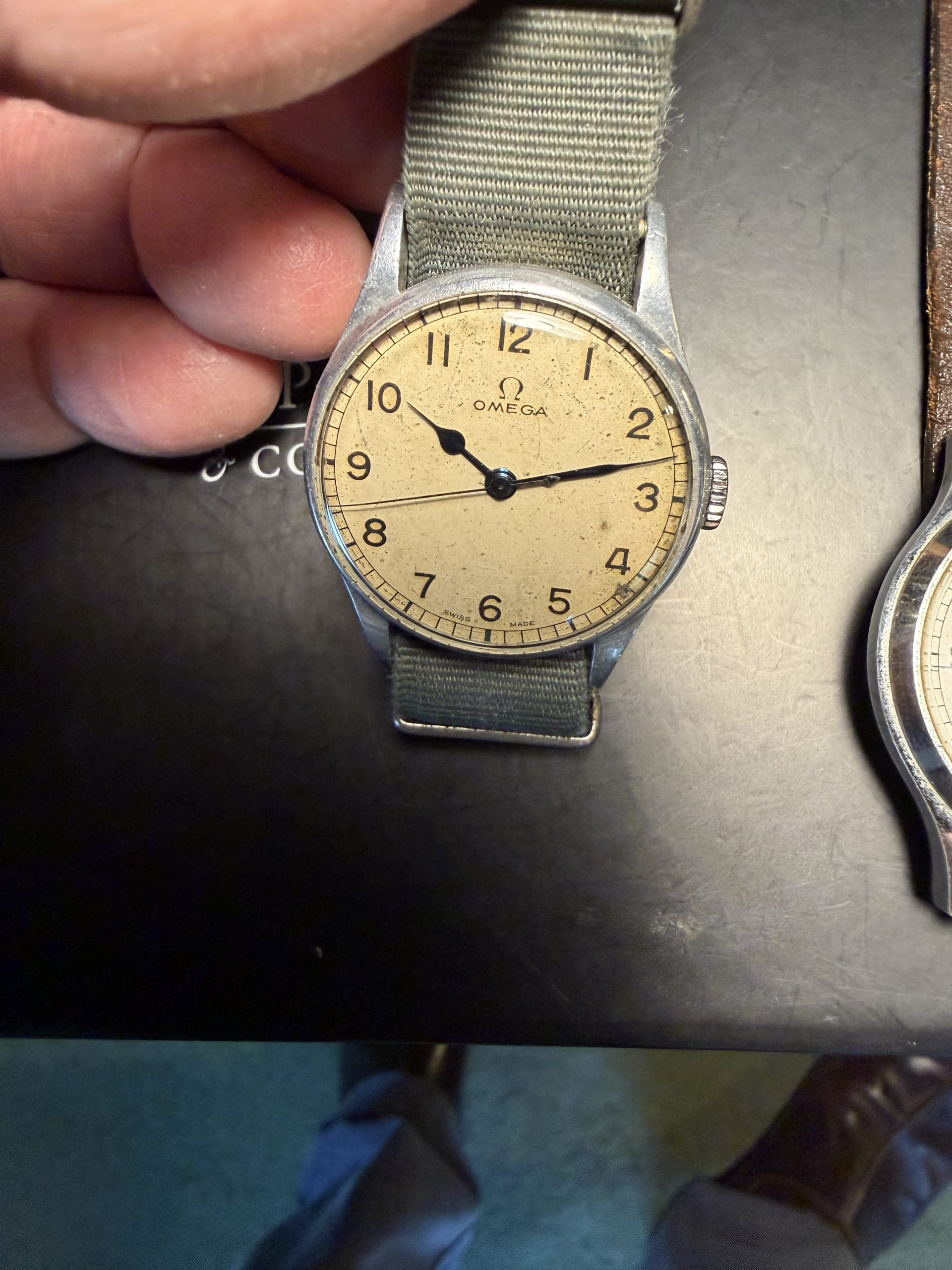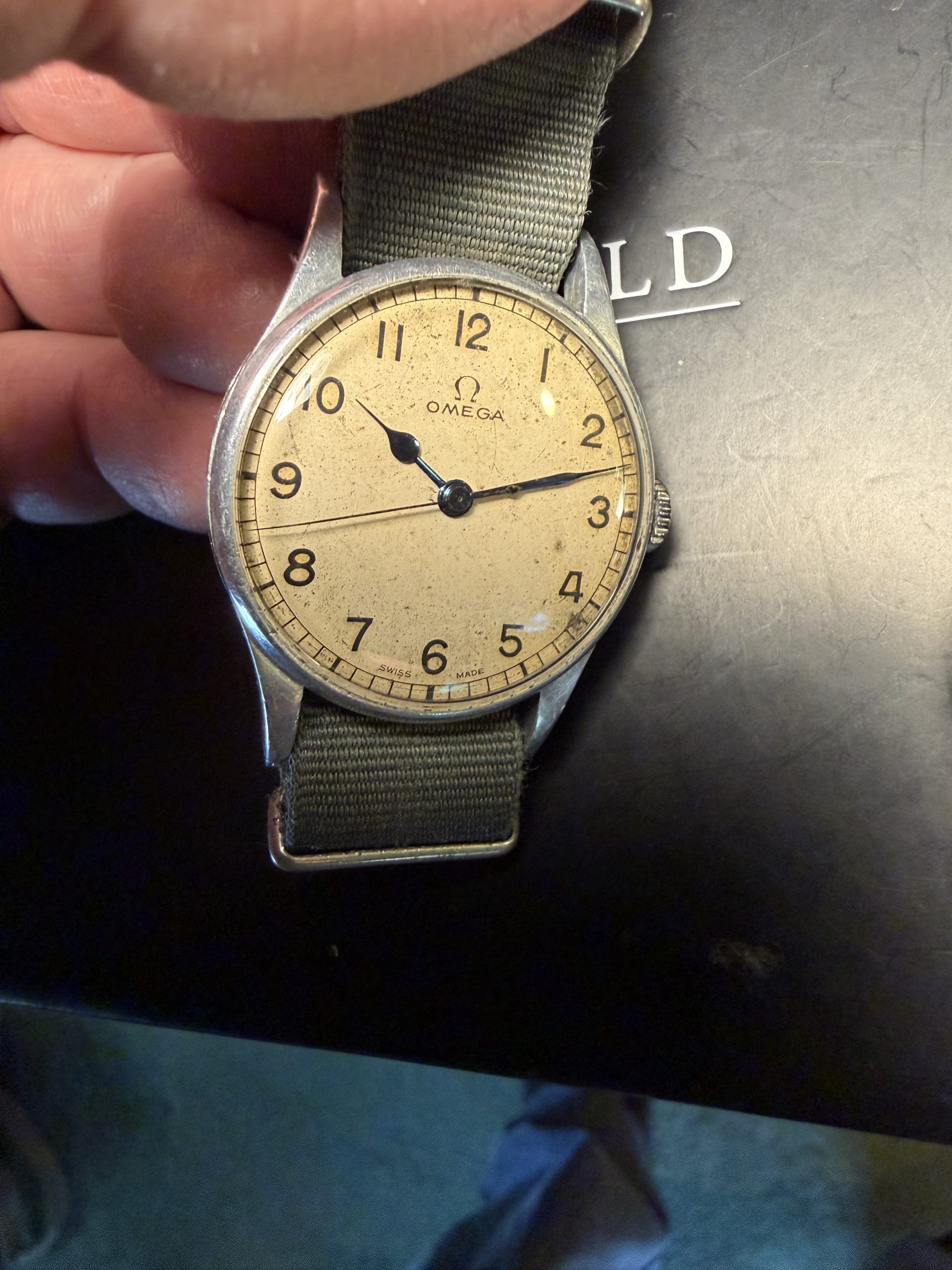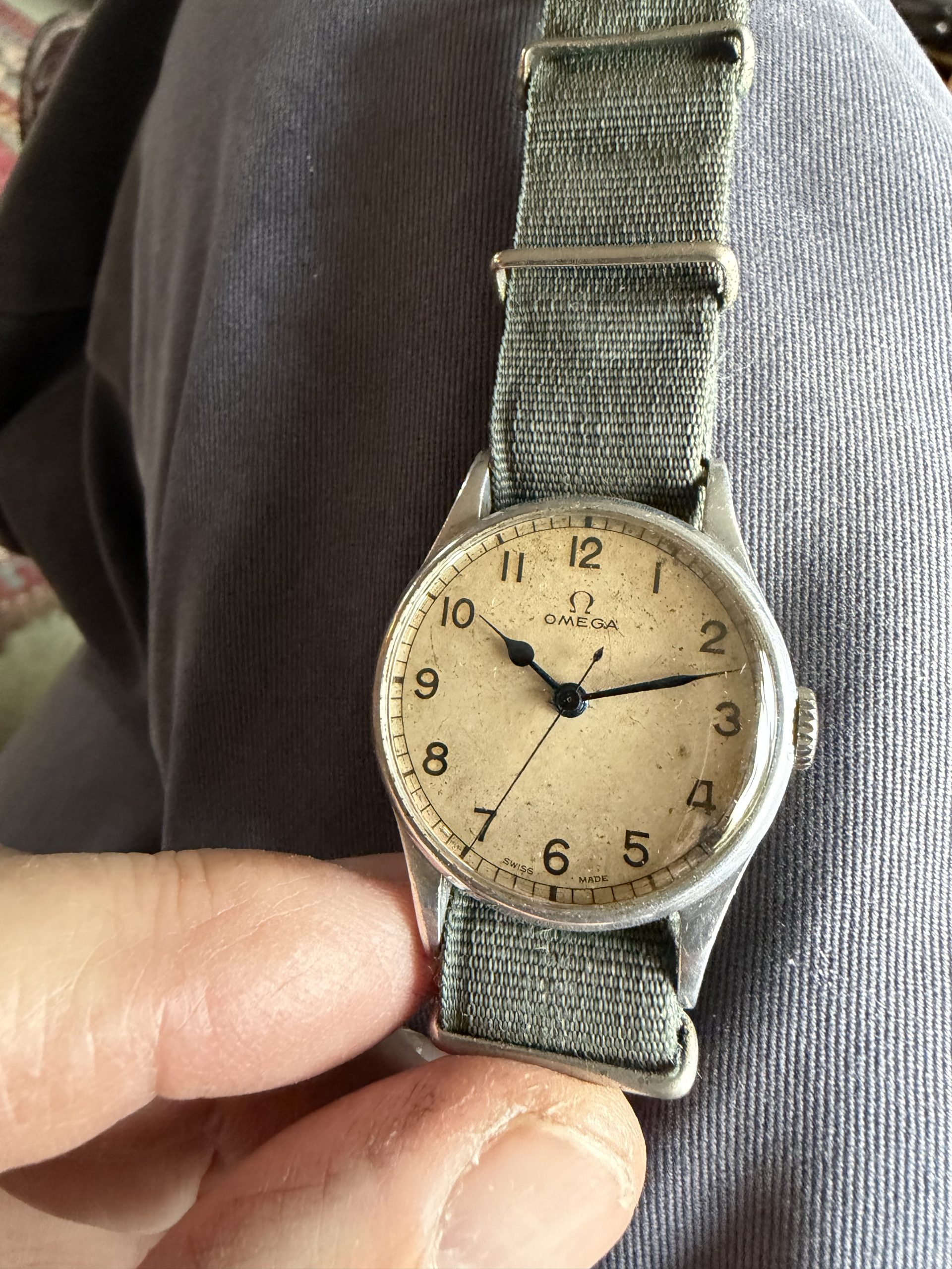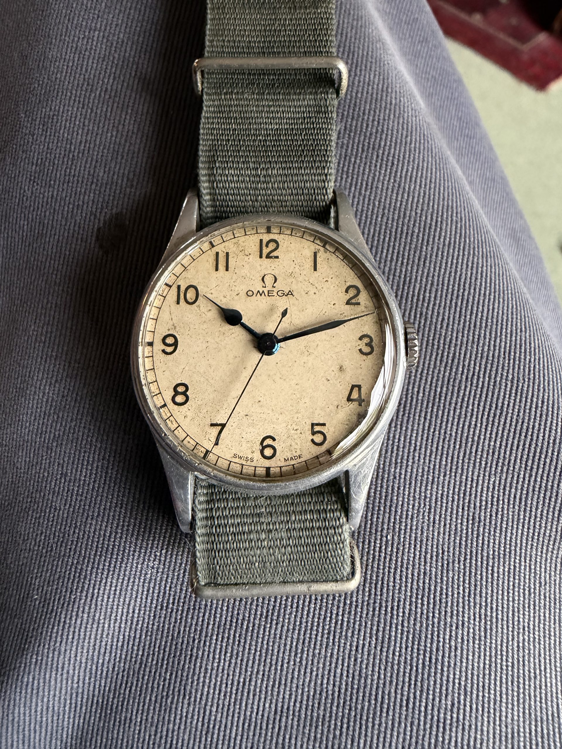 Lovely original military dial signed Omega Swiss Made with original blues-steel hands and correct unsigned winding crown.