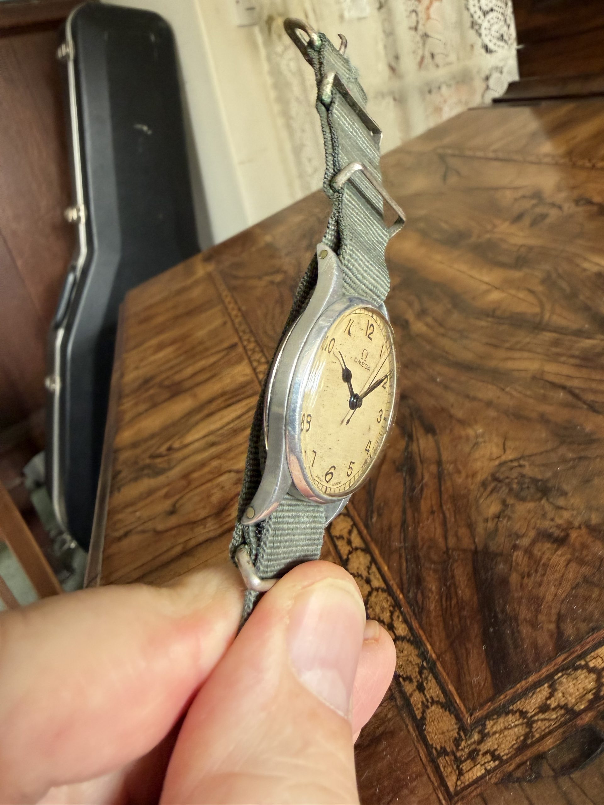 A rare and beautiful RAF Fighter Pilot’s Watch from 1943. This is the rarer early version issued by the Air Ministry and stamped A.M 6B/159 on the case-back.