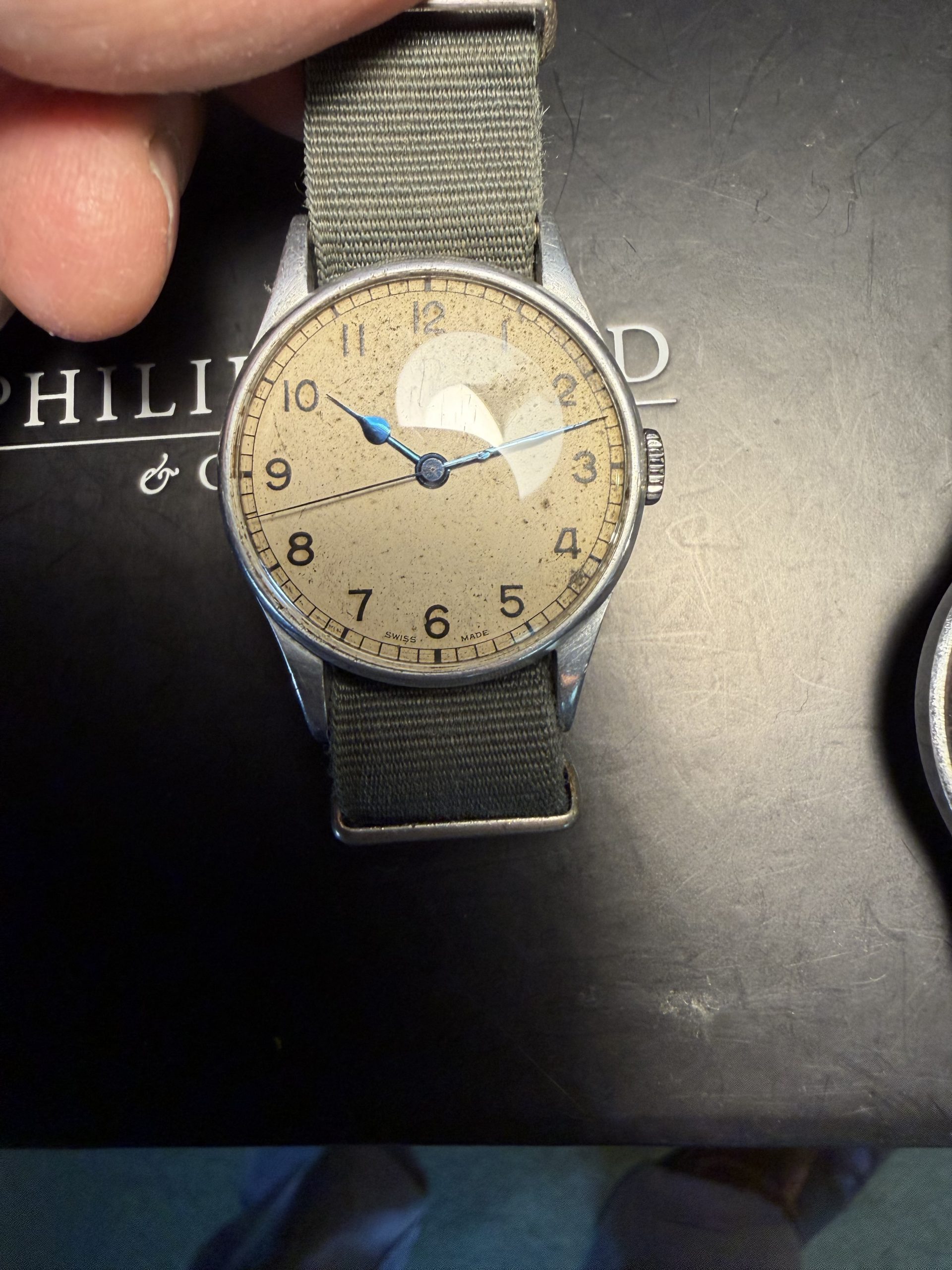 the stainless steel case-back is correctly stamped with Air Ministry RAF military issue markings.