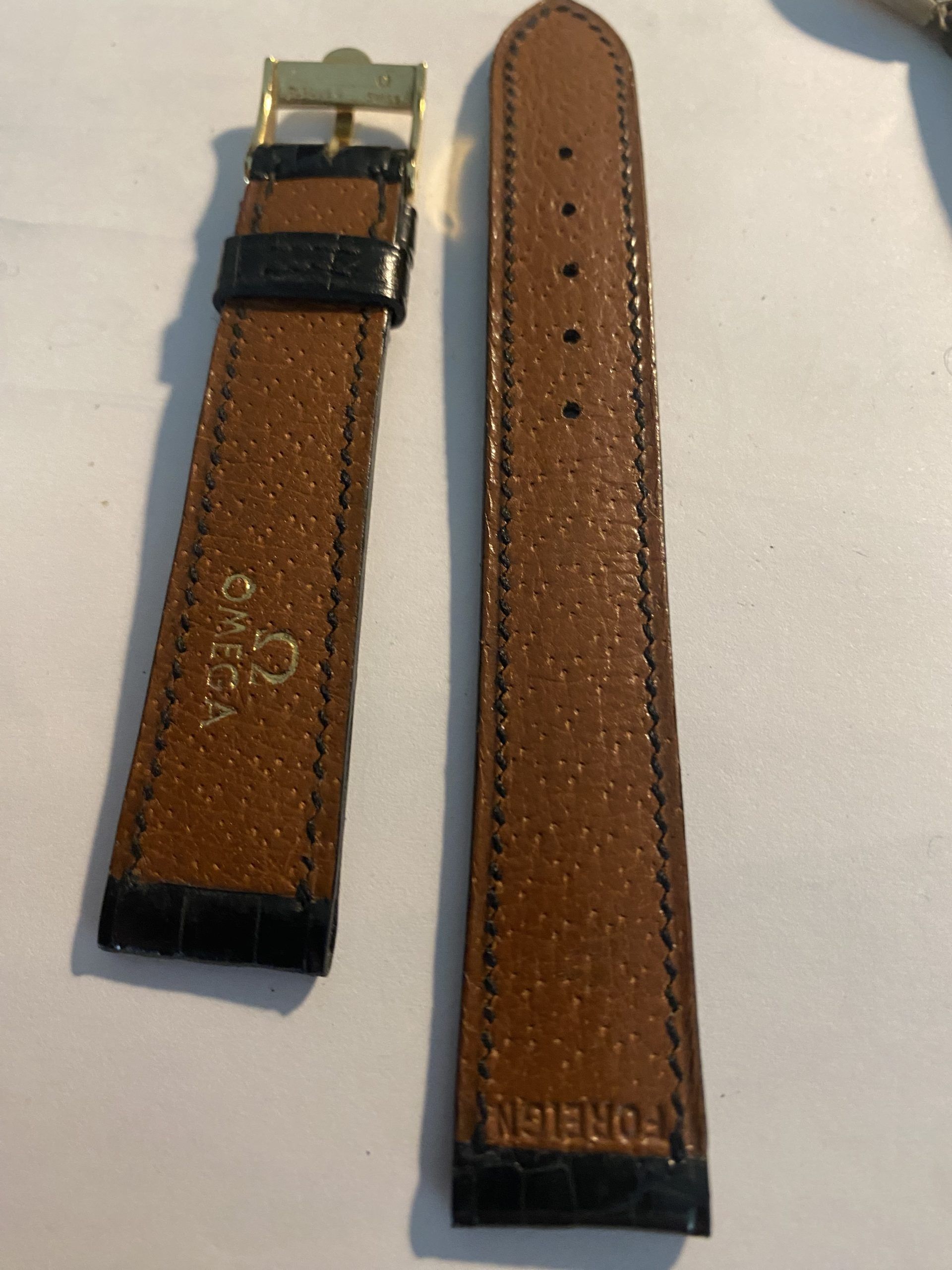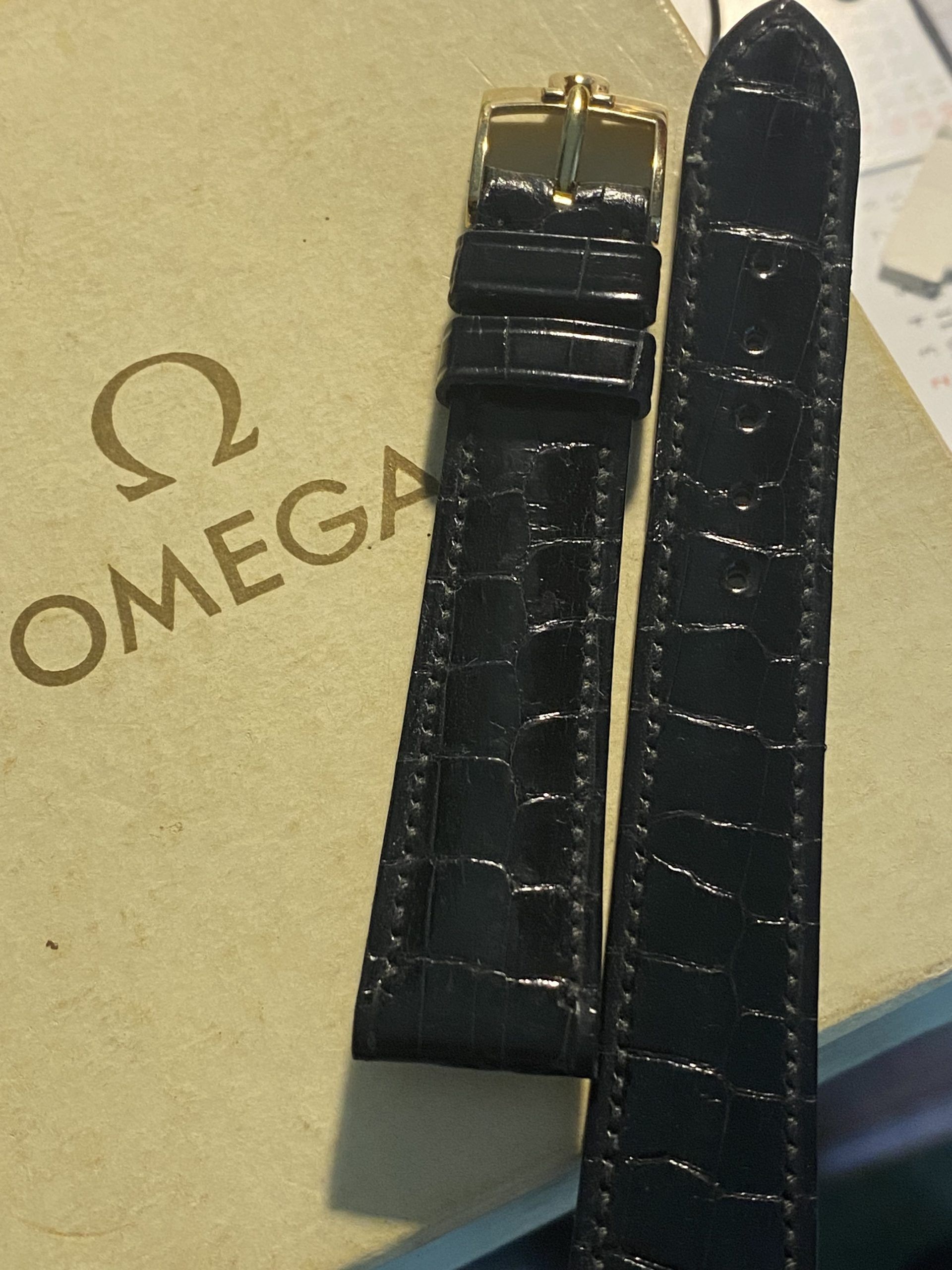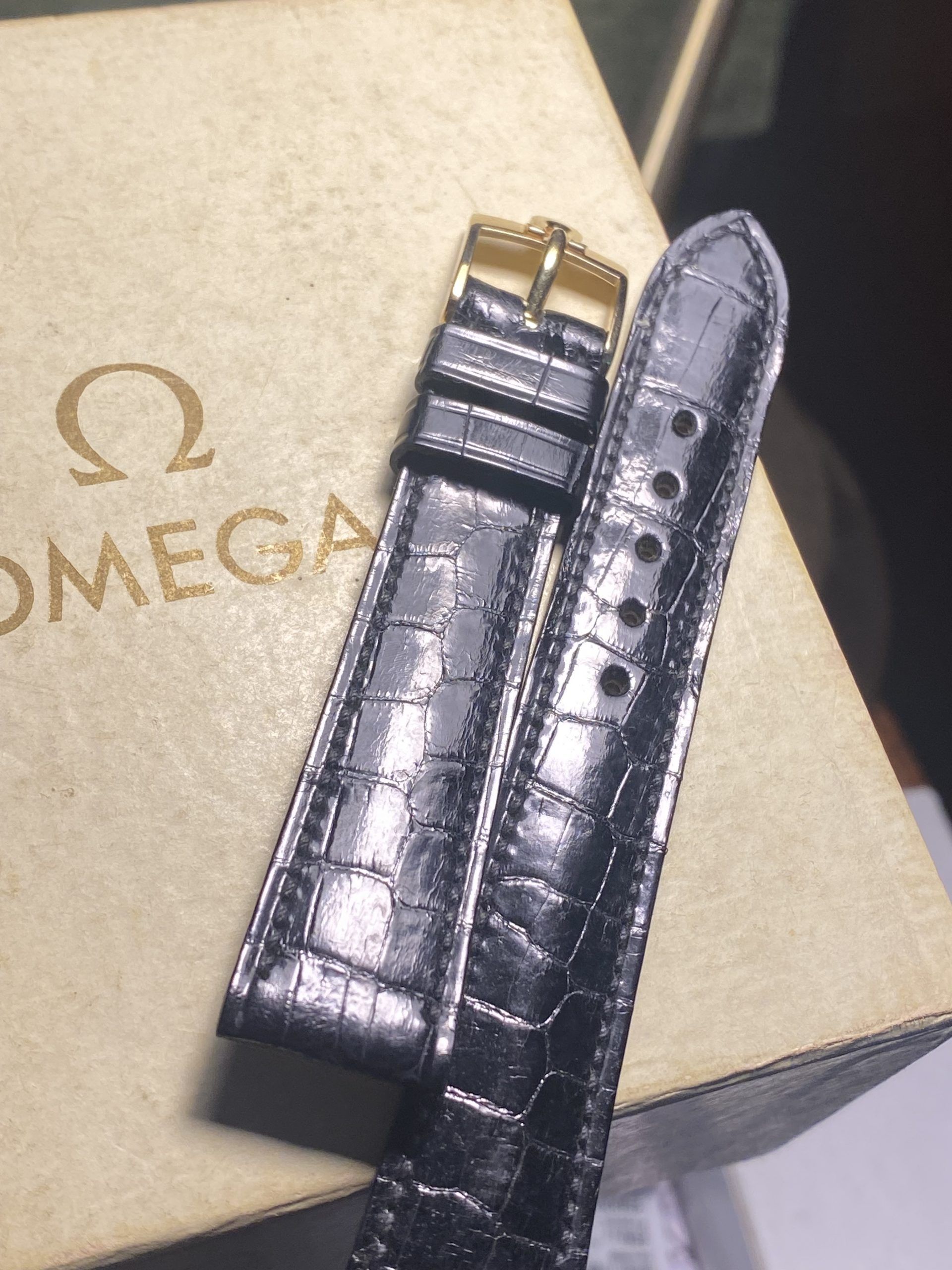 Perfect to too sob off your treasured gold 1960’s/1960’s Vintage O Eva, this new old stock never been used on a watch before black Aligator Strap with gold embossed Knega and correctly stamped vintage Omega Gold buckle is the perfect set.