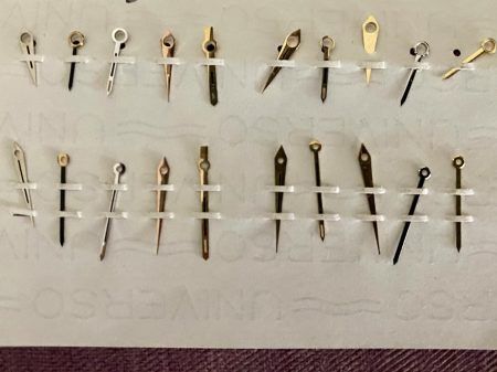 We have been lucky enough to acquire sheets of new old stock vintage Omega Hamdsets from a retiring Omega Watchmaker, both gold and steel handsets.